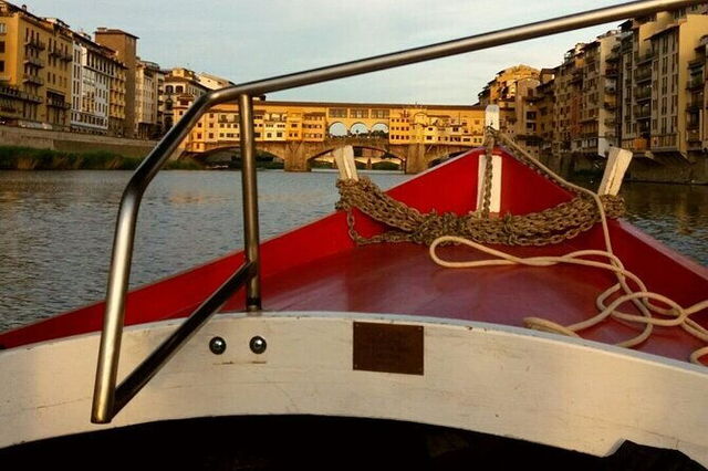 Bootsfahrt in Florenz an Bord eines traditionellen Bootes Segeln Sie entlang des Flusses Arno und passieren Sie die Ponte Vecchio Genießen Sie einen frischen toskanischen Weißwein oder Rosé, während Sie den Fluss entlangfahren Ein authentisches italienisches Frühstück während der Morgentour wird von uns angeboten