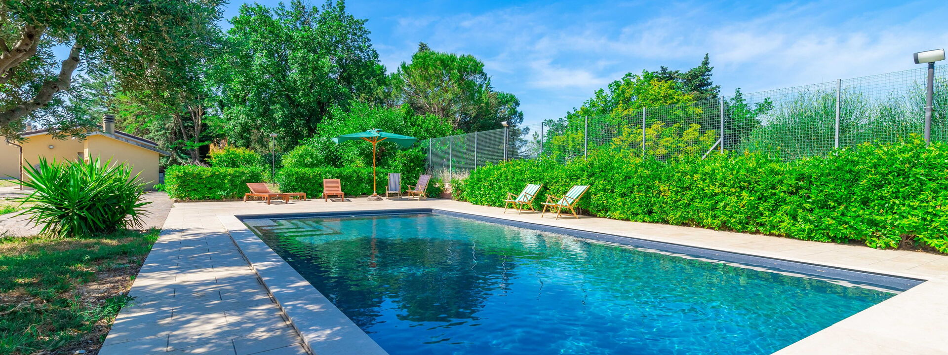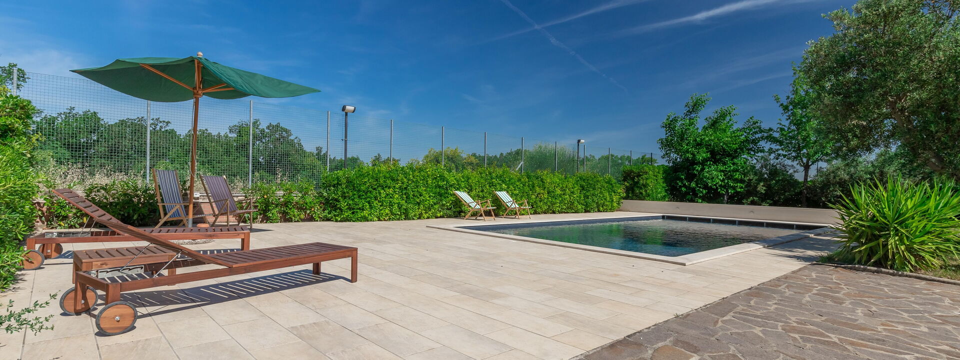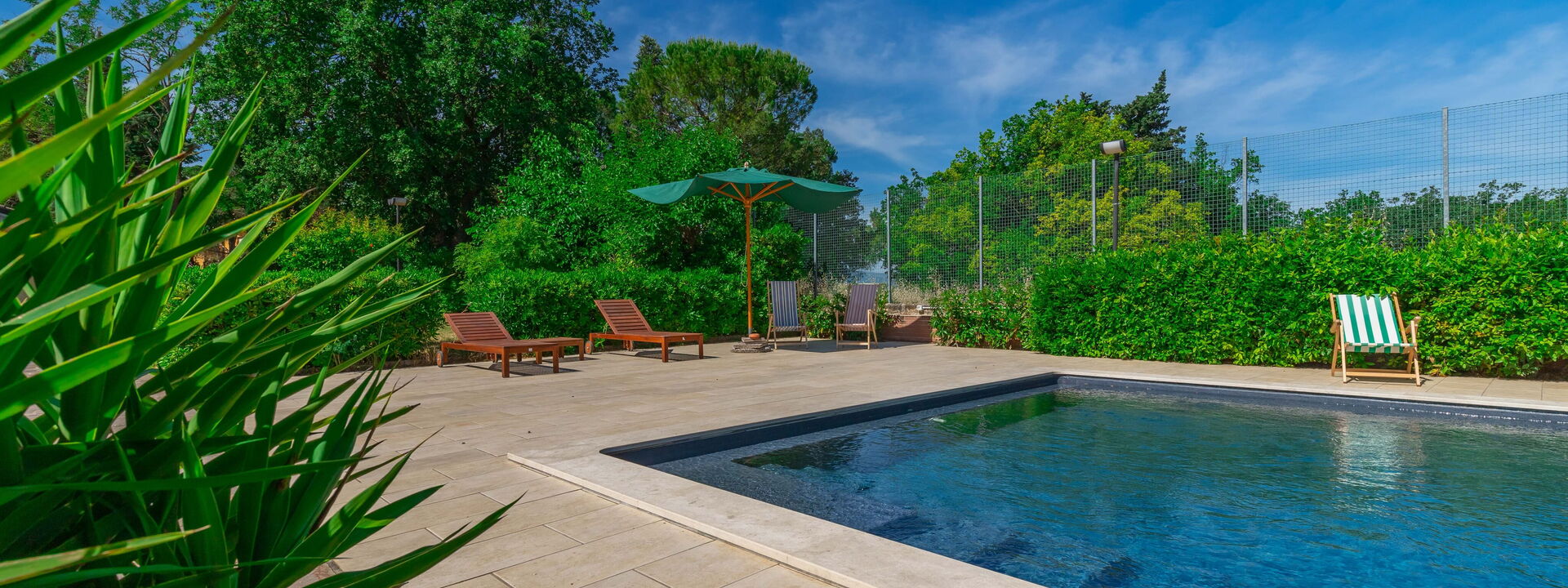 Das Haus ist von einem großen, vollständig eingezäunten Garten mit einem ausgestatteten Essbereich, einem exklusiven Swimmingpool und Umkleidekabinen mit Dusche umgeben.