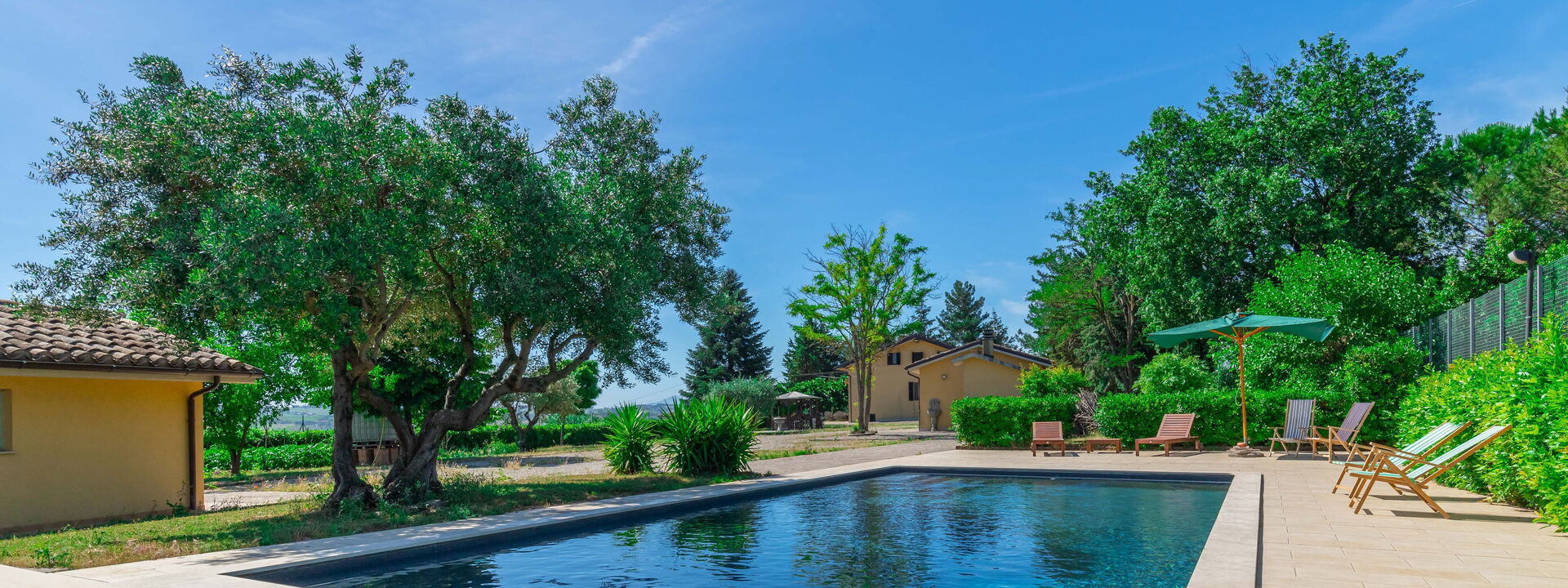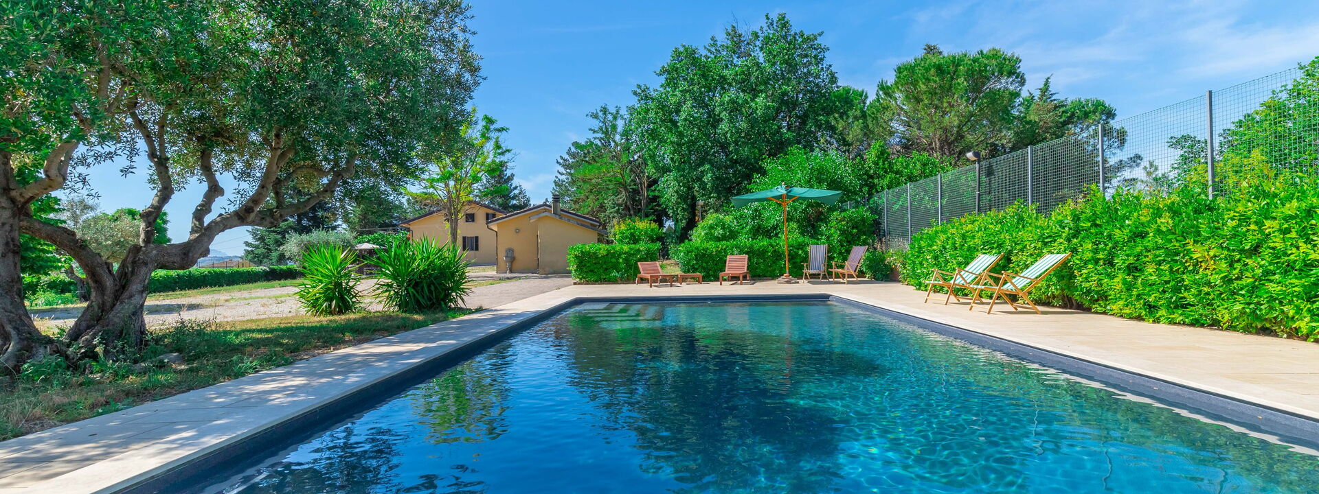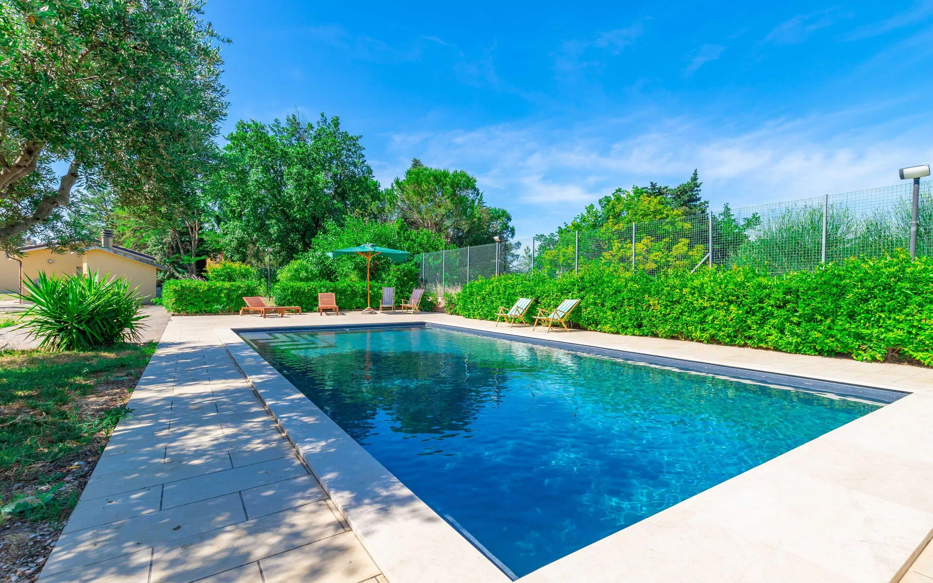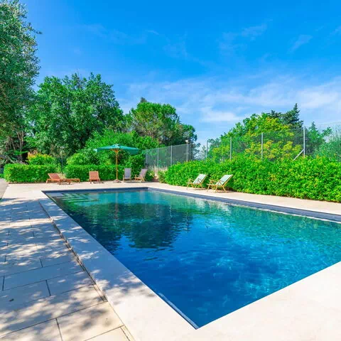 Das Haus ist von einem großen, vollständig eingezäunten Garten mit einem ausgestatteten Essbereich, einem exklusiven Swimmingpool und Umkleidekabinen mit Dusche umgeben.
