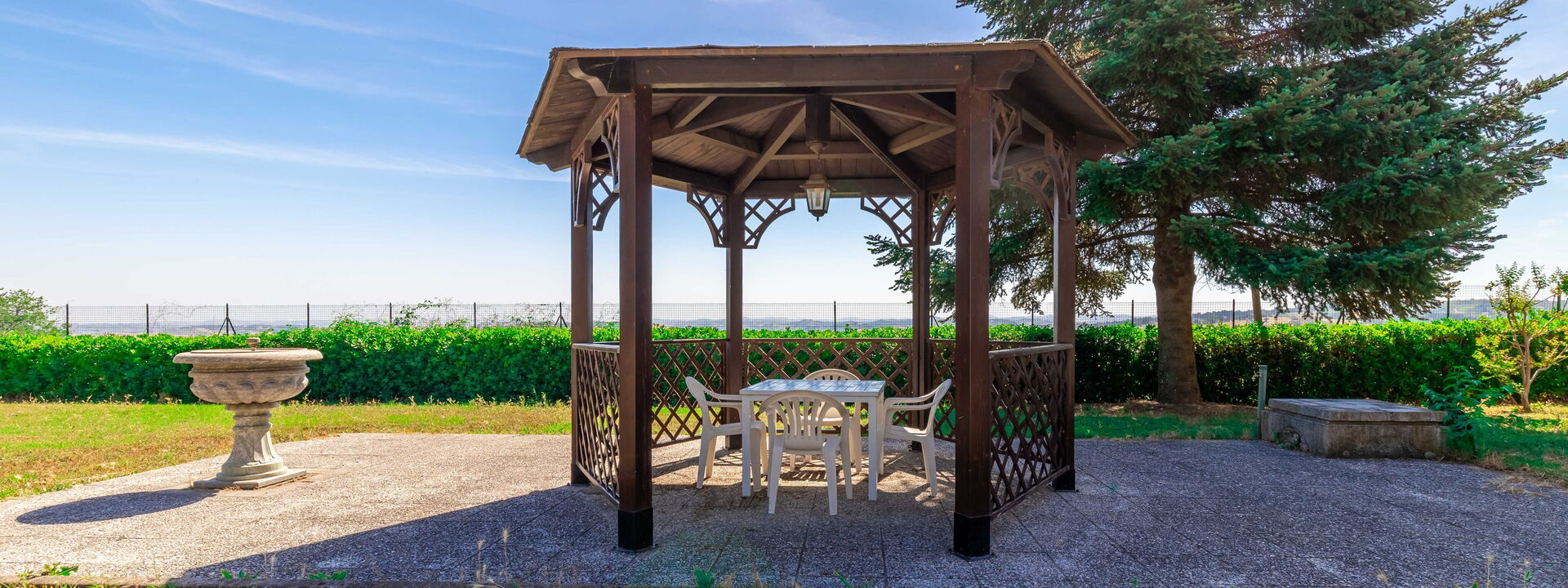 Außenbereich für das Essen im Freien, Grill, Esstisch, eingezäunt, Schwimmbad, Terrassenmöbel, WiFi Internet