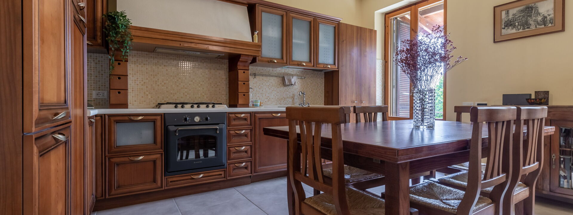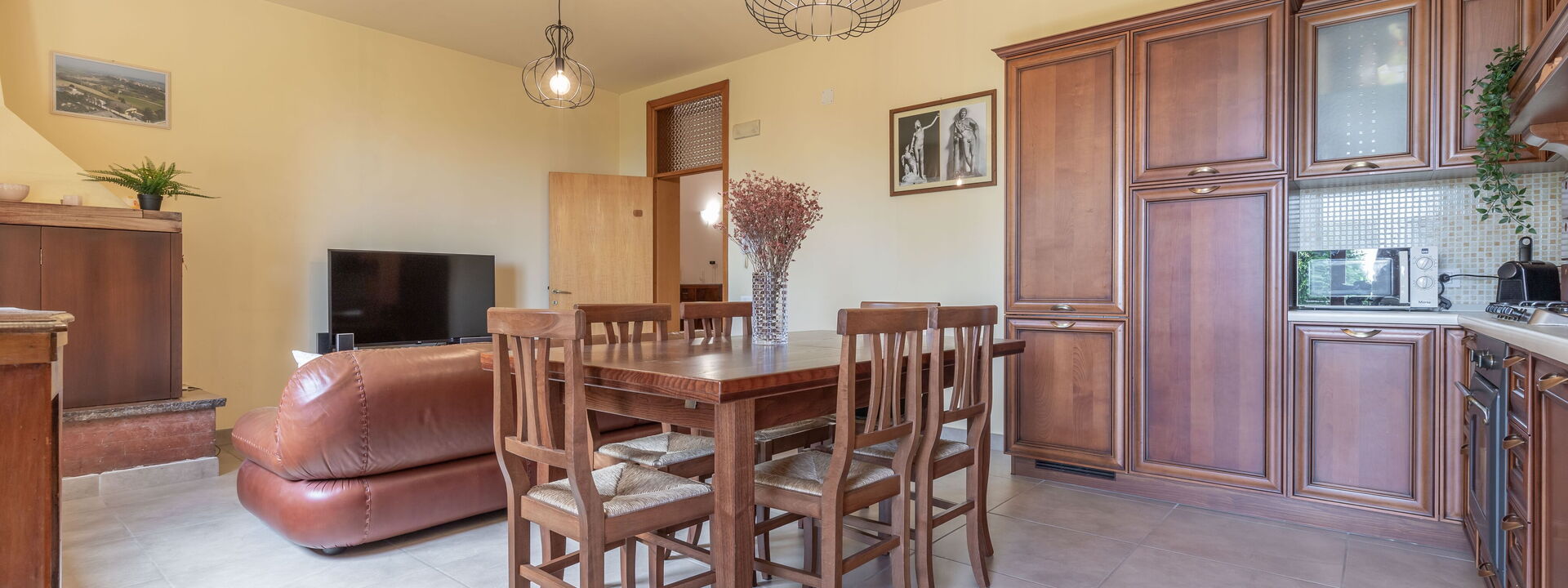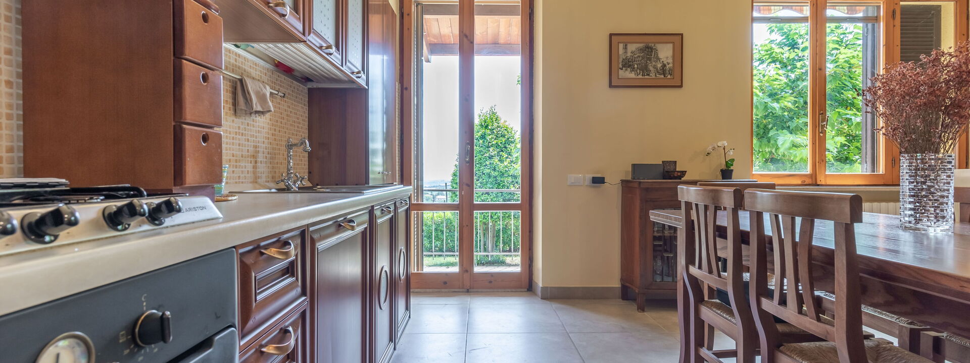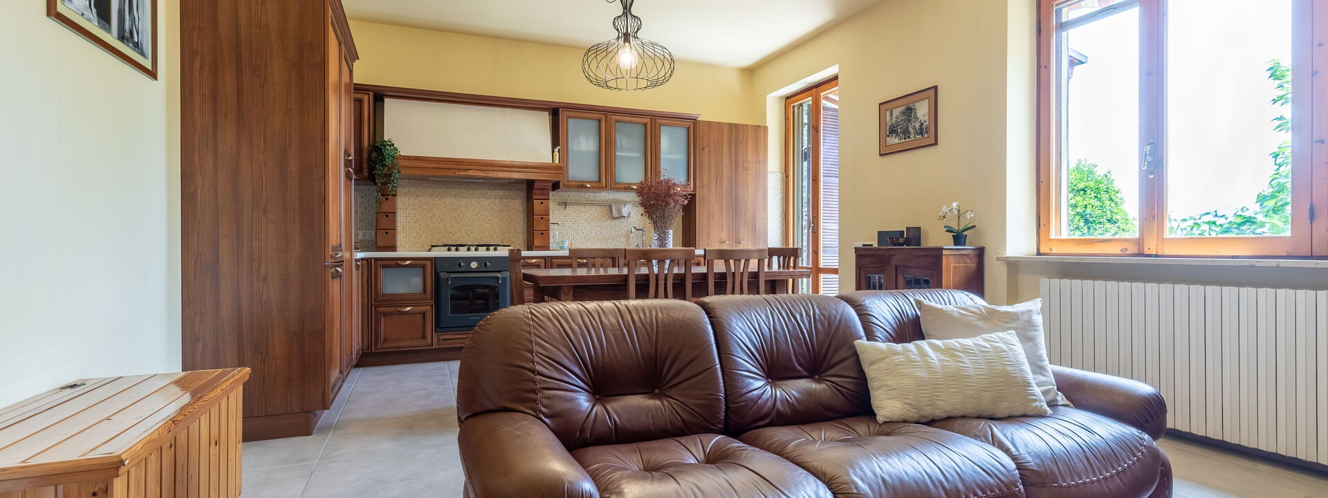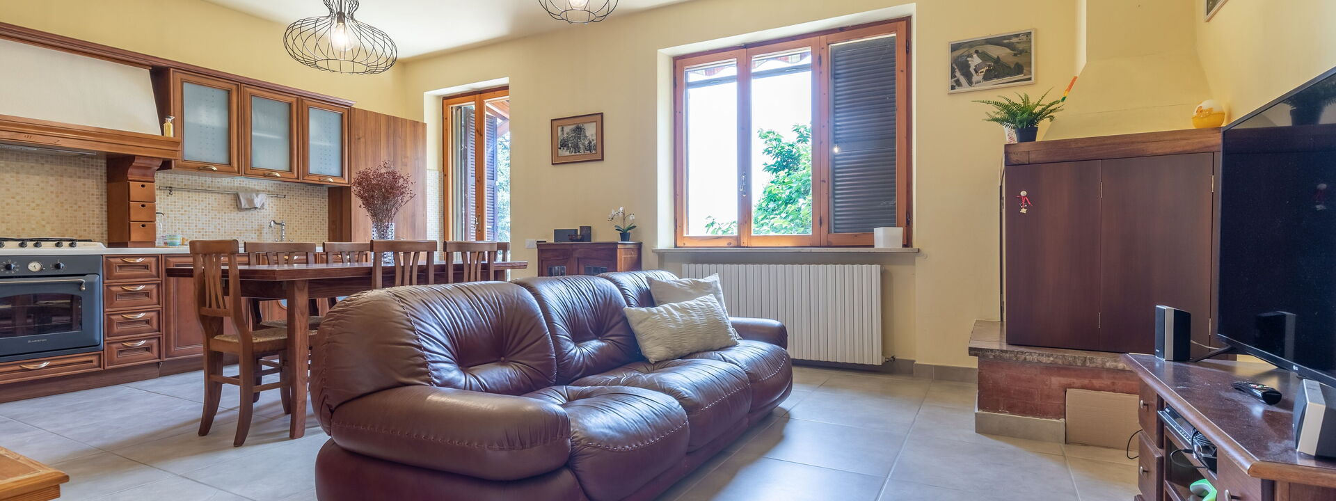 1 voll ausgestattete Küche mit Sitzecke mit Sofa und Kamin mit französischen Fenstern mit direktem Zugang zum Garten