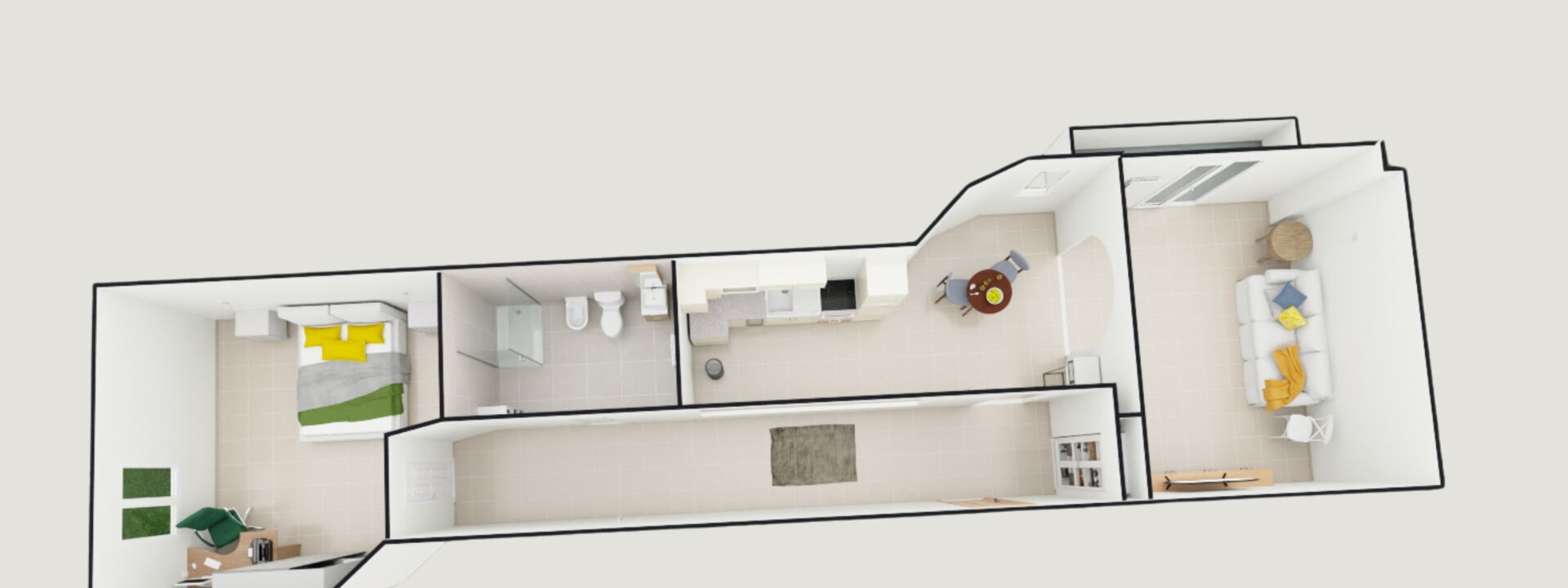 Wohnbereich mit Sofa, Couchtisch und TV