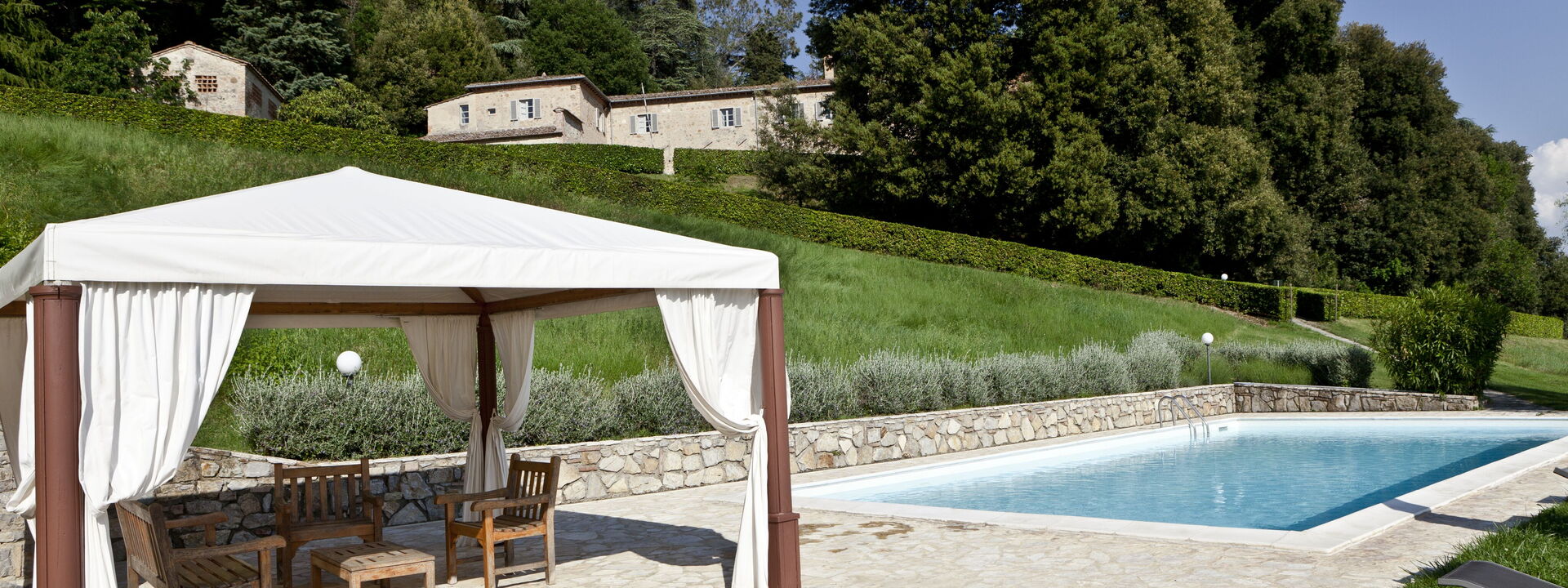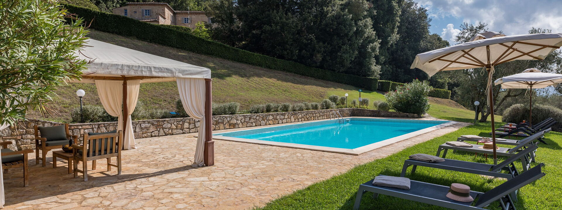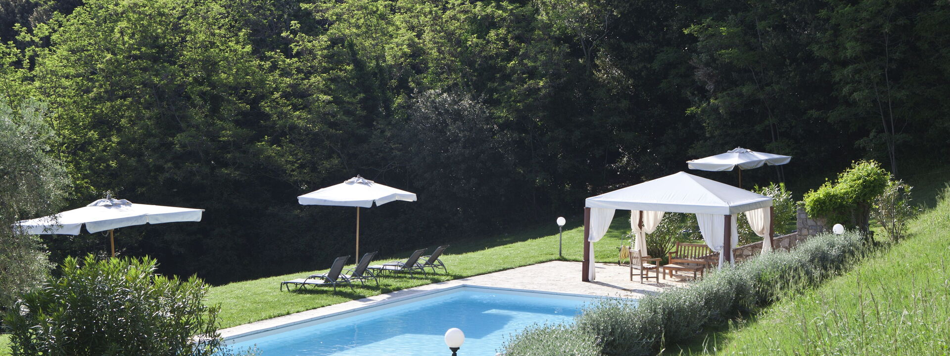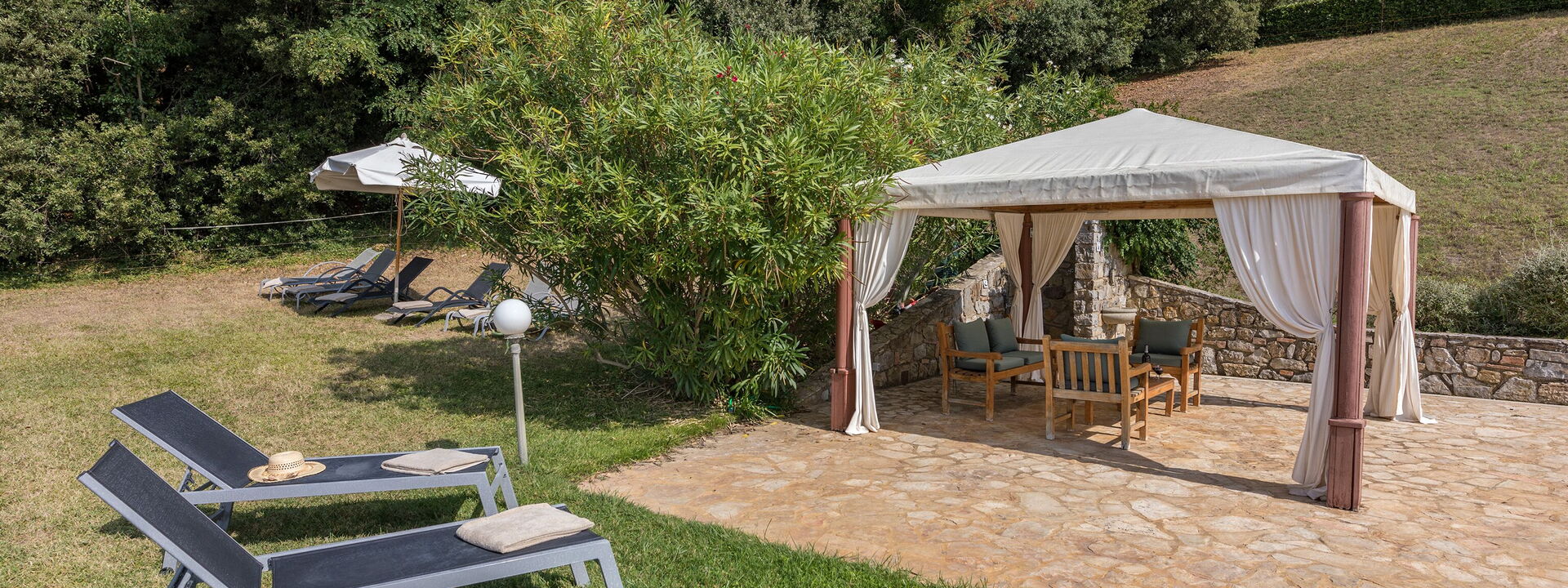 Jedes Apartment verfügt über einen eigenen Garten mit einem Bereich zum Essen gehen und die 3 Apartments teilen sich den Pool. Die 2 Bauernhäuser sind stattdessen zwei unabhängige Villen mit jeweils einem großen privaten Garten, der mit Ruhebereichen, Gartenmöbeln und Essbereich sowie einem exklusiven Swimmingpool ausgestattet ist.