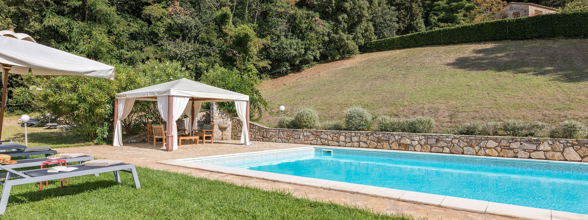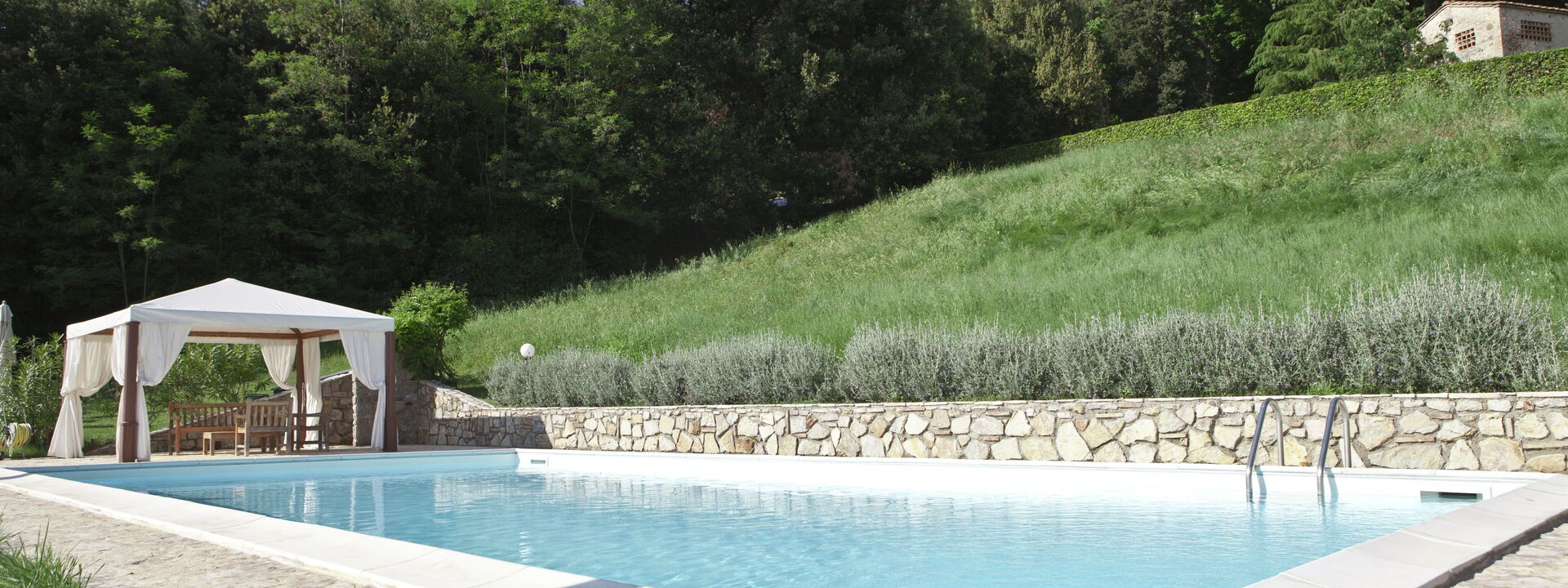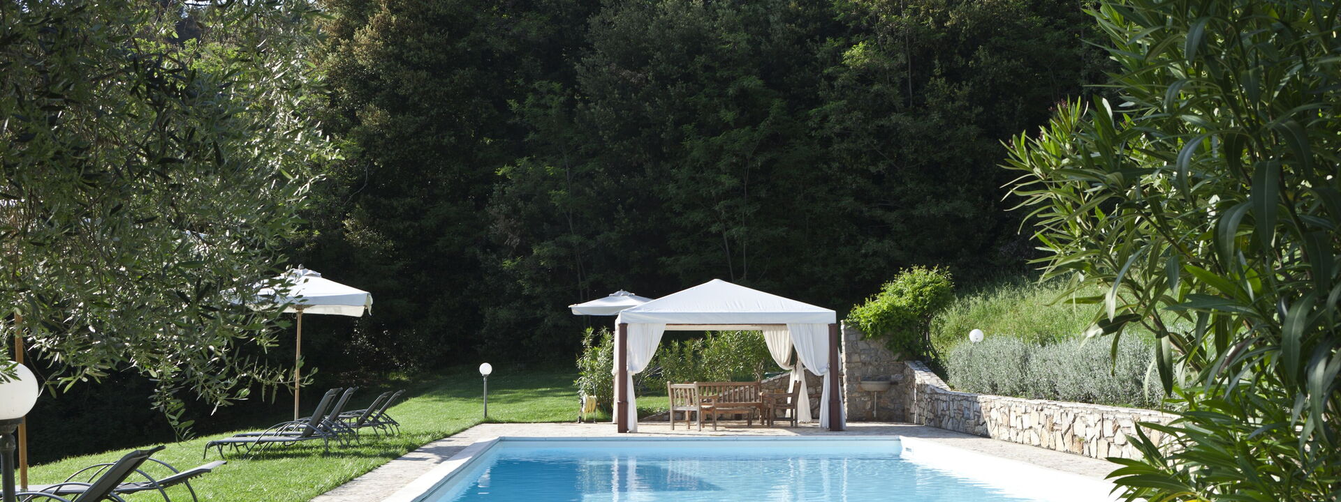 Jedes Apartment verfügt über einen eigenen Garten mit einem Bereich zum Essen gehen und die 3 Apartments teilen sich den Pool. Die 2 Bauernhäuser sind stattdessen zwei unabhängige Villen mit jeweils einem großen privaten Garten, der mit Ruhebereichen, Gartenmöbeln und Essbereich sowie einem exklusiven Swimmingpool ausgestattet ist.