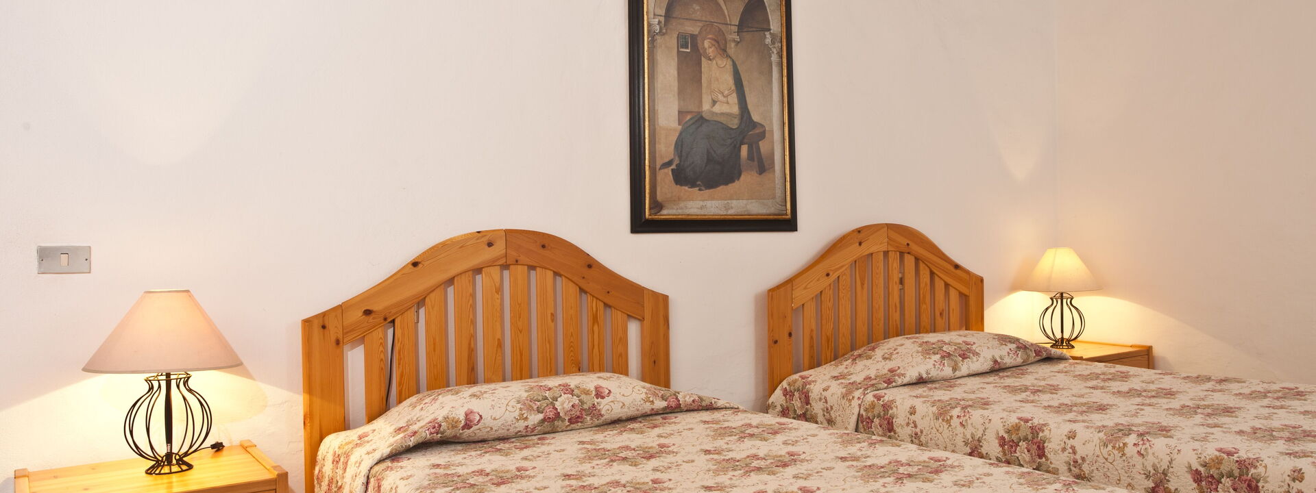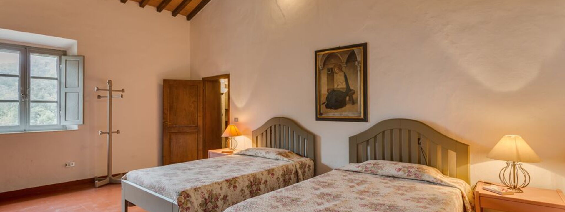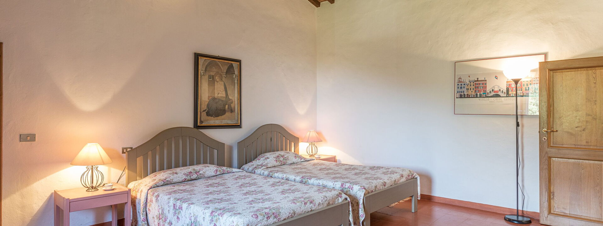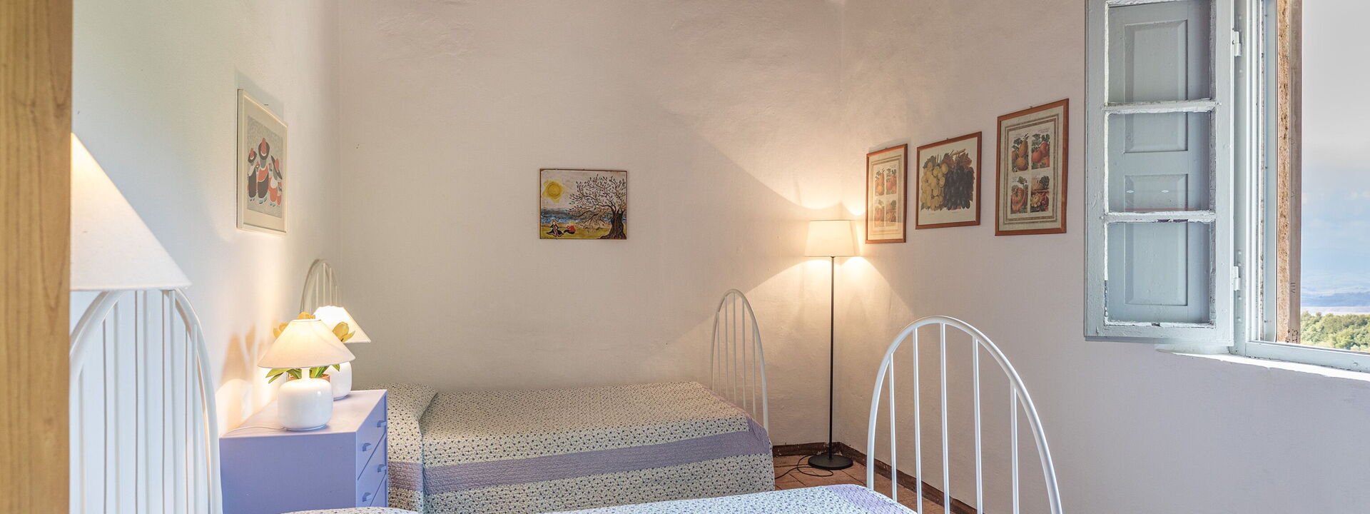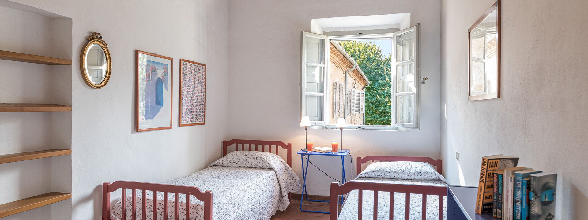 1 Schlafzimmer mit zwei Einzelbetten (90x180), umwandelbar in ein Doppelbett mit eigenem Bad mit Fenster mit Waschbecken, Bidet, WC und Badewanne mit Dusche