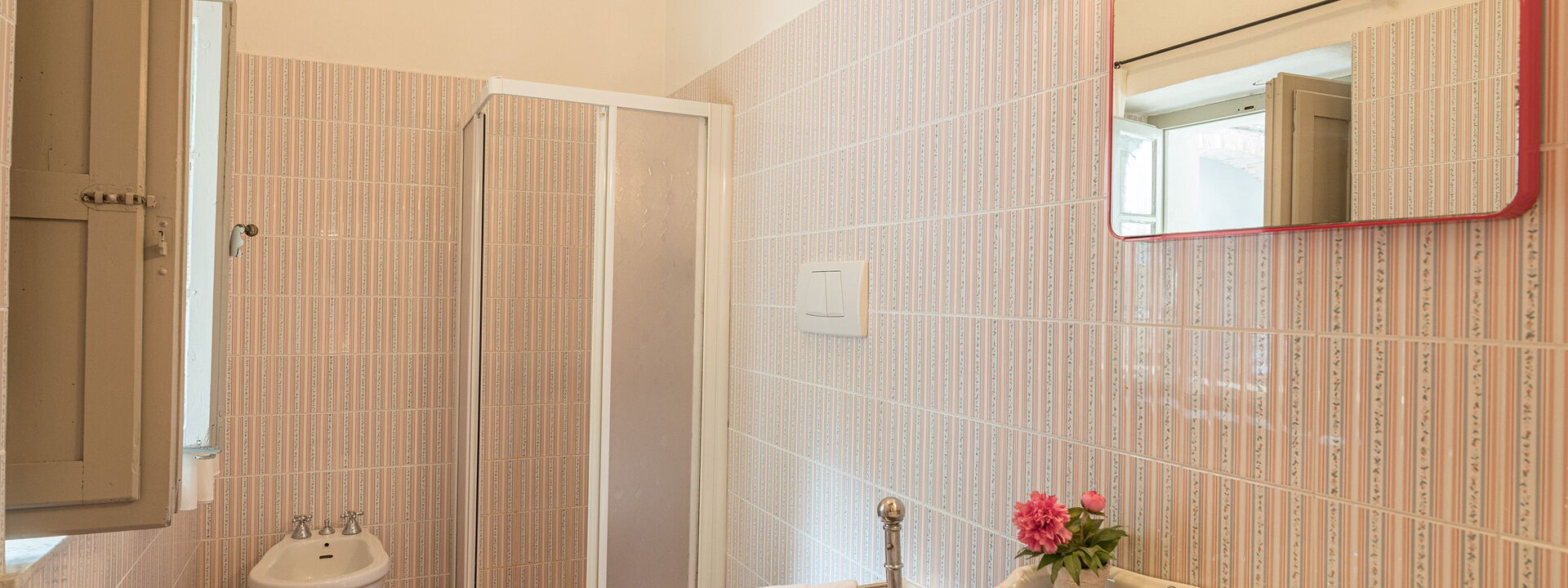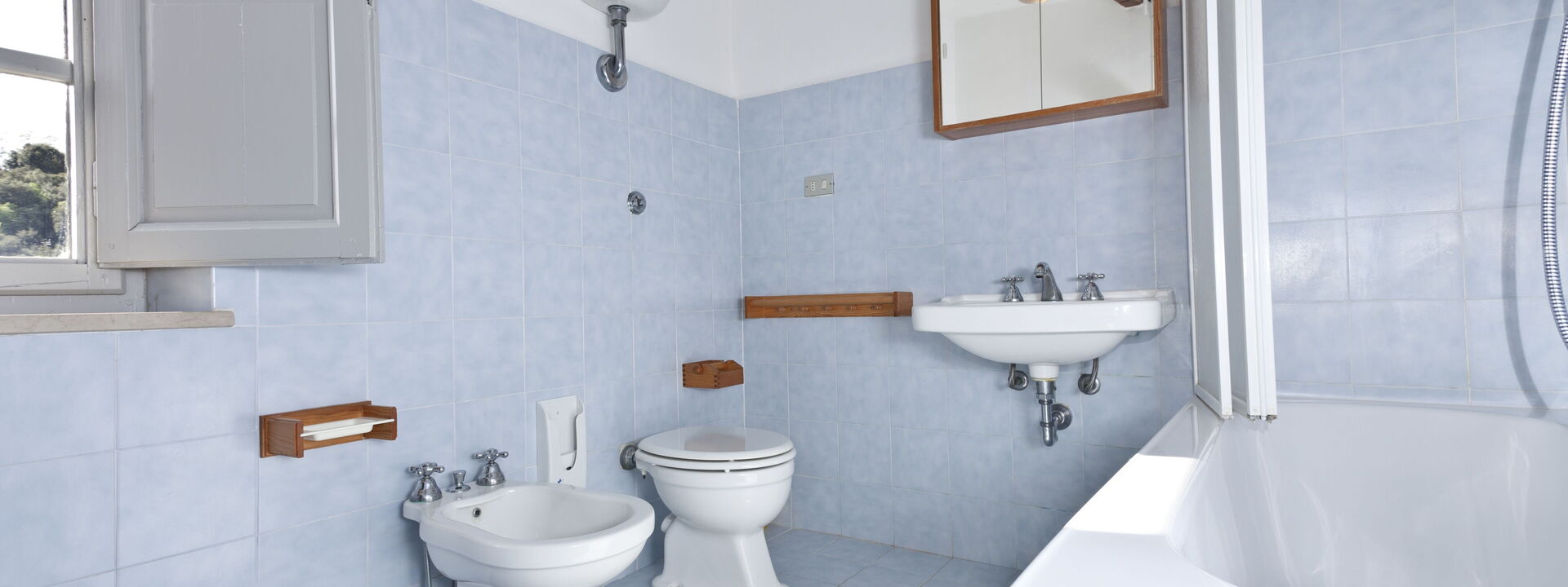 1 Badezimmer mit Fenster mit Waschbecken, Toilette, Bidet und Dusche