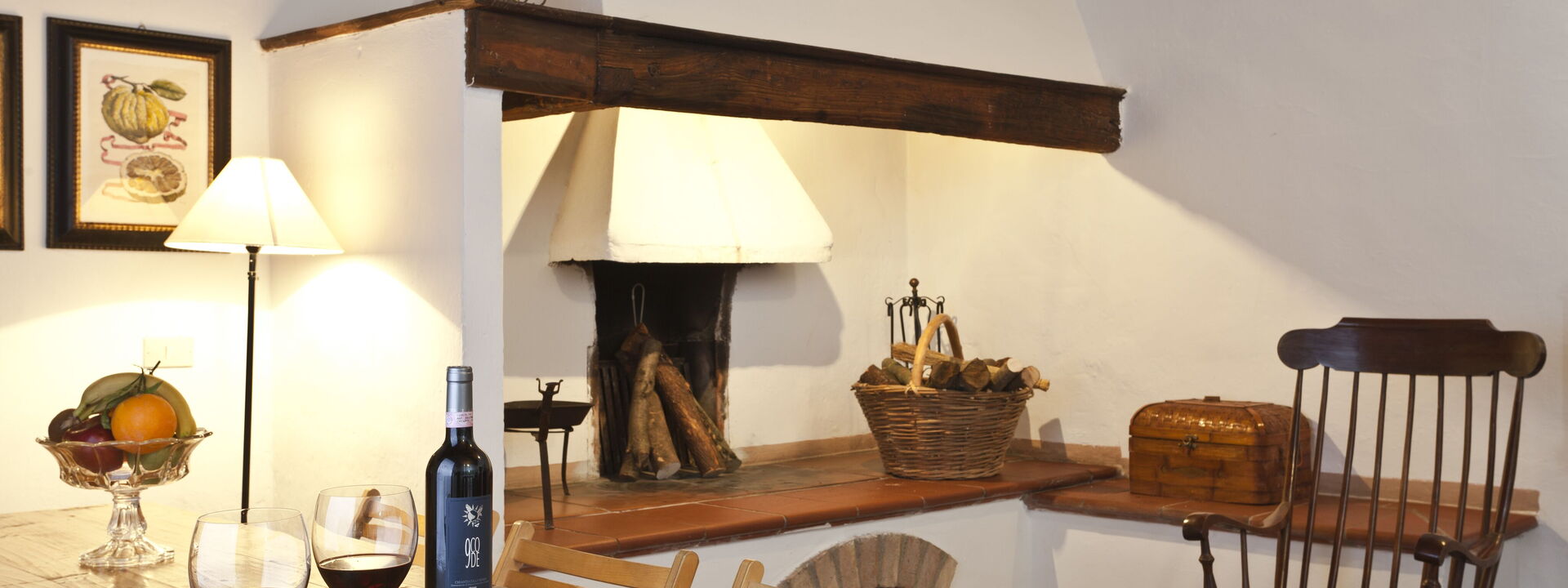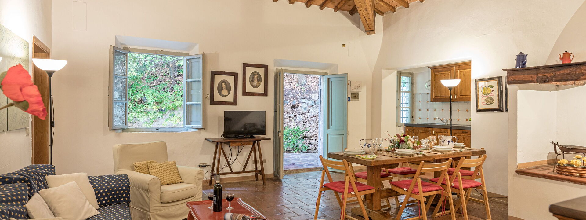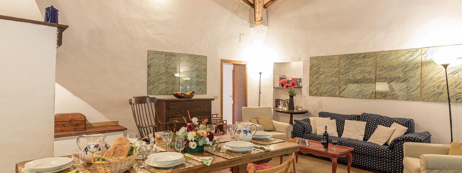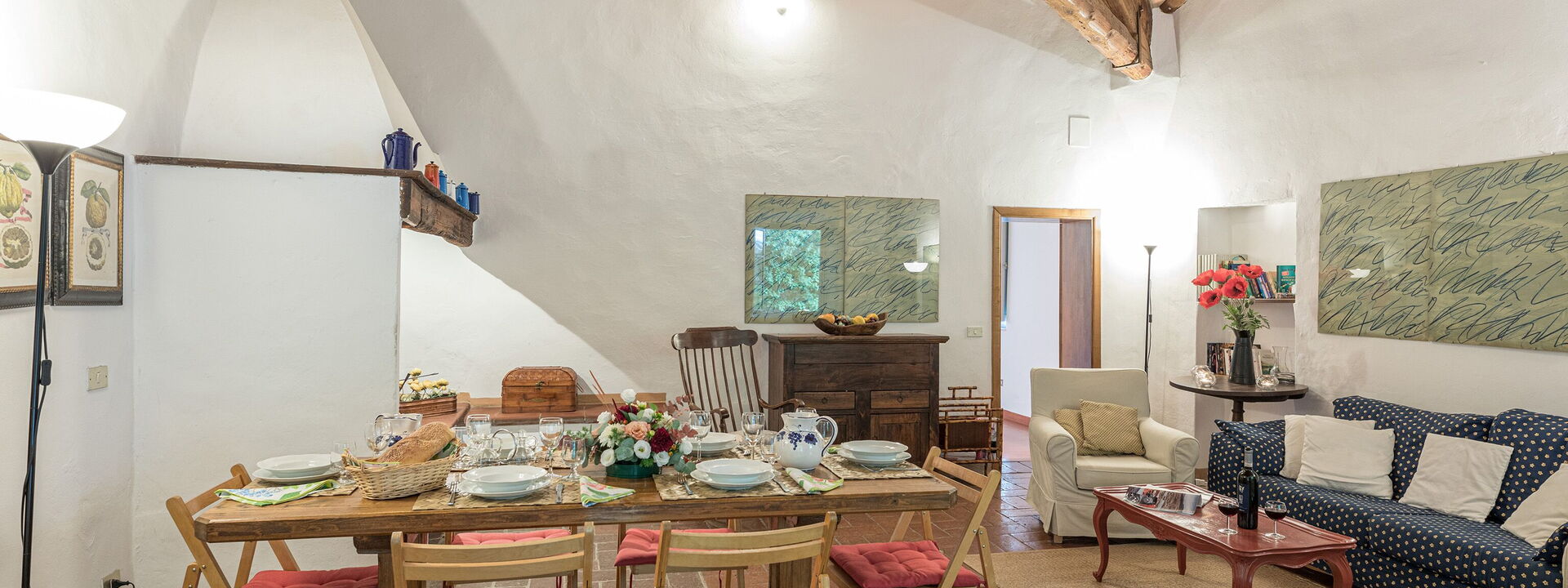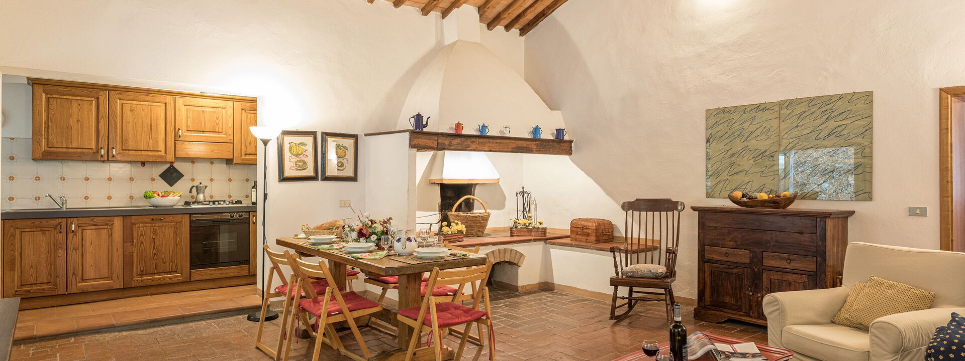 großes Wohnzimmer mit Sofas und Sesseln, antiker Kamin im typisch toskanischen Stil, Esstisch mit Insel für 6 Personen