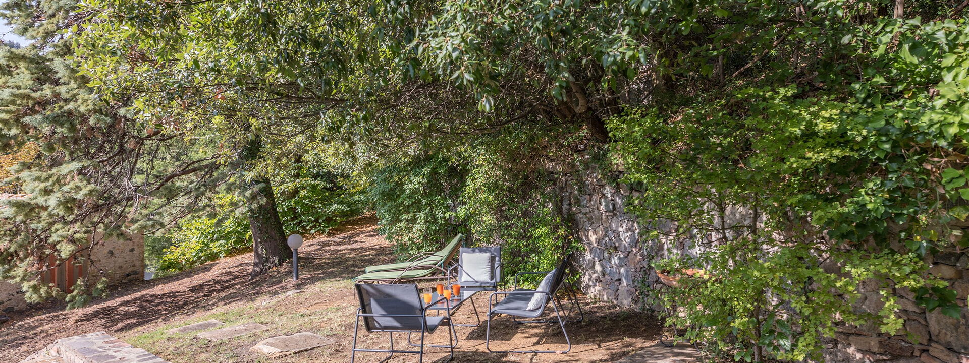 privater Garten von ca. 50 Quadratmetern mit Tischen und Stühlen, Sonnenschirm und Liegestühlen;