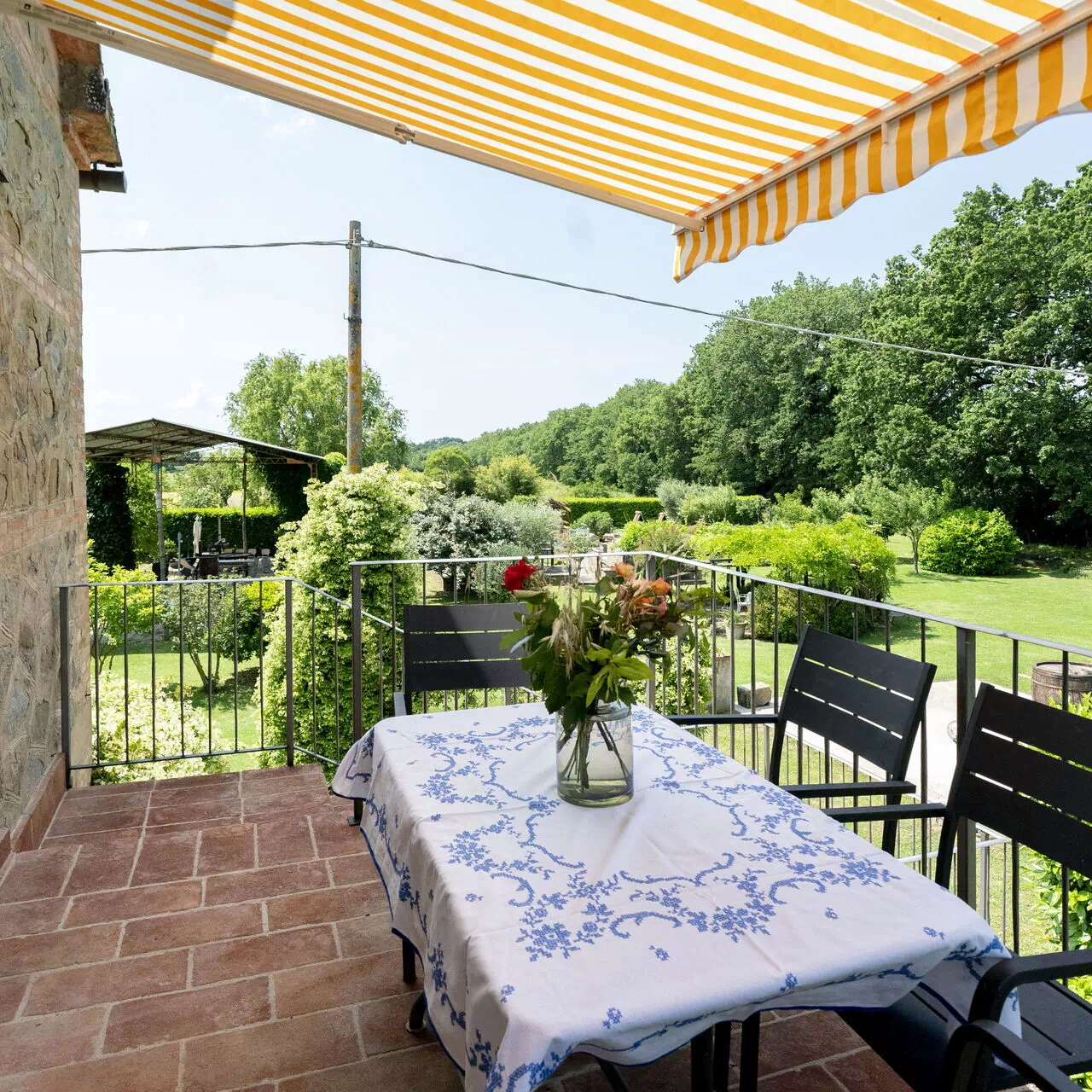 75 Quadratmeter große Wohnung im ersten Stock des Gebäudes, erreichbar über eine Außentreppe. Es verfügt über eine Panoramaterrasse mit direktem Blick auf den Garten.