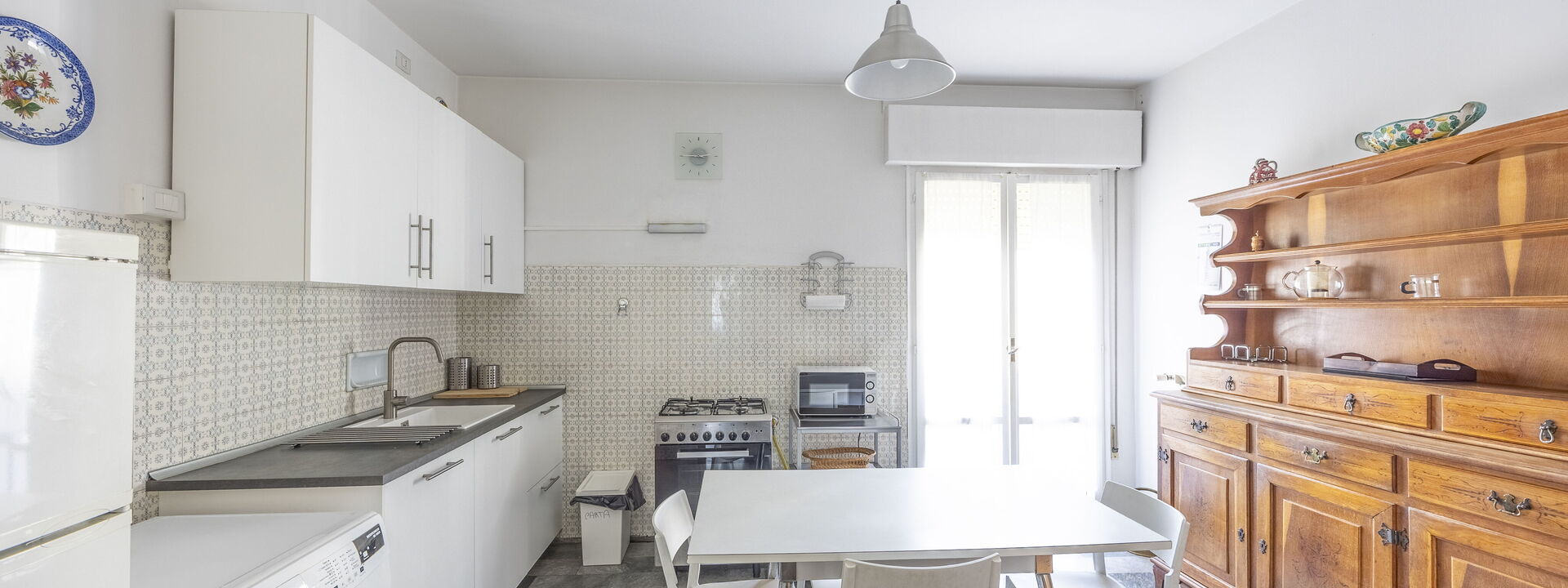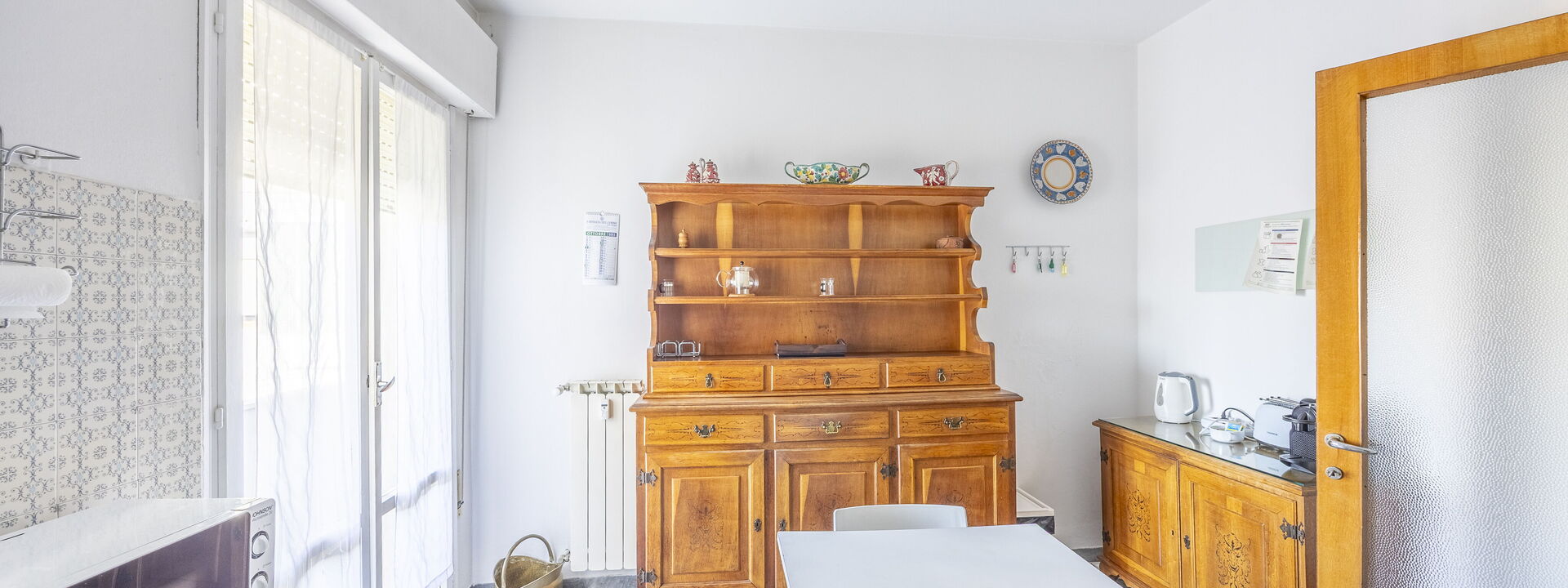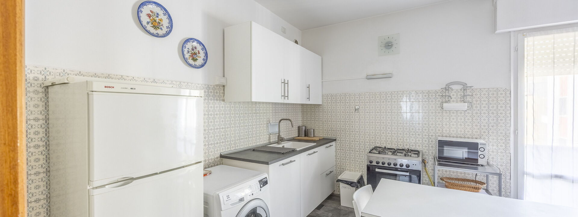Amerikanische Kaffeemaschine, Esstisch, Ausgang auf den Balkon, Tiefkühler, Kühlschrank, Italienische Kaffeemaschine, Mikrowelle, Ofen, Herd, Toaster, gut ausgestattete Küche, WiFi Internet