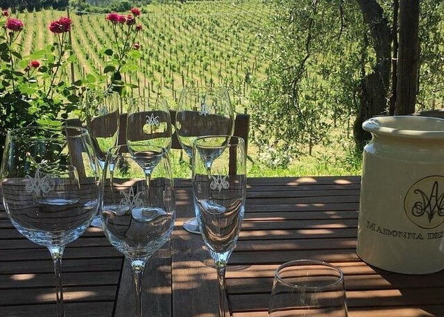 This experience combines a tour of the Madonna del Latte winery just outside Orvieto with generous wine tastings. Take a guided walk through the vineyards and learn about the winery's cultivation methods. Then, head to the cellars and barrel rooms, the latter of which was carved from tuff rock thousands of years ago. After the tour, taste five house-made wines. A walking tour of a winery just outside Orvieto. Explore the winery's vineyards and cellars with a guide. Taste the winery's catalog: five house wines. Learn about local cultivation and winemaking methods.