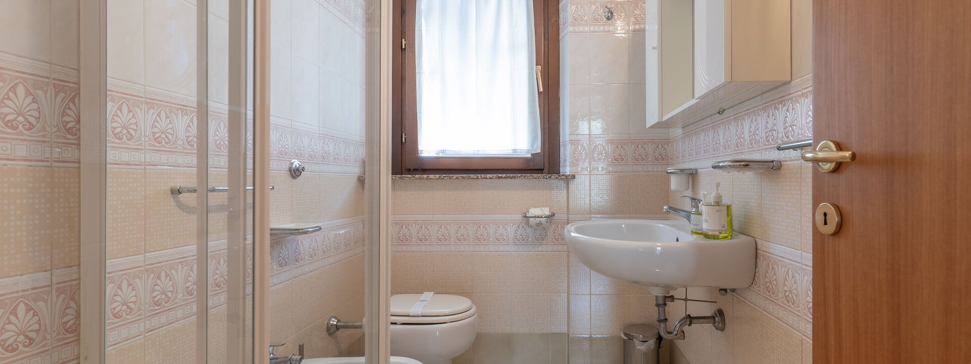1 salle de bain complète avec fenêtre avec douche, lavabo, bidet et toilette
