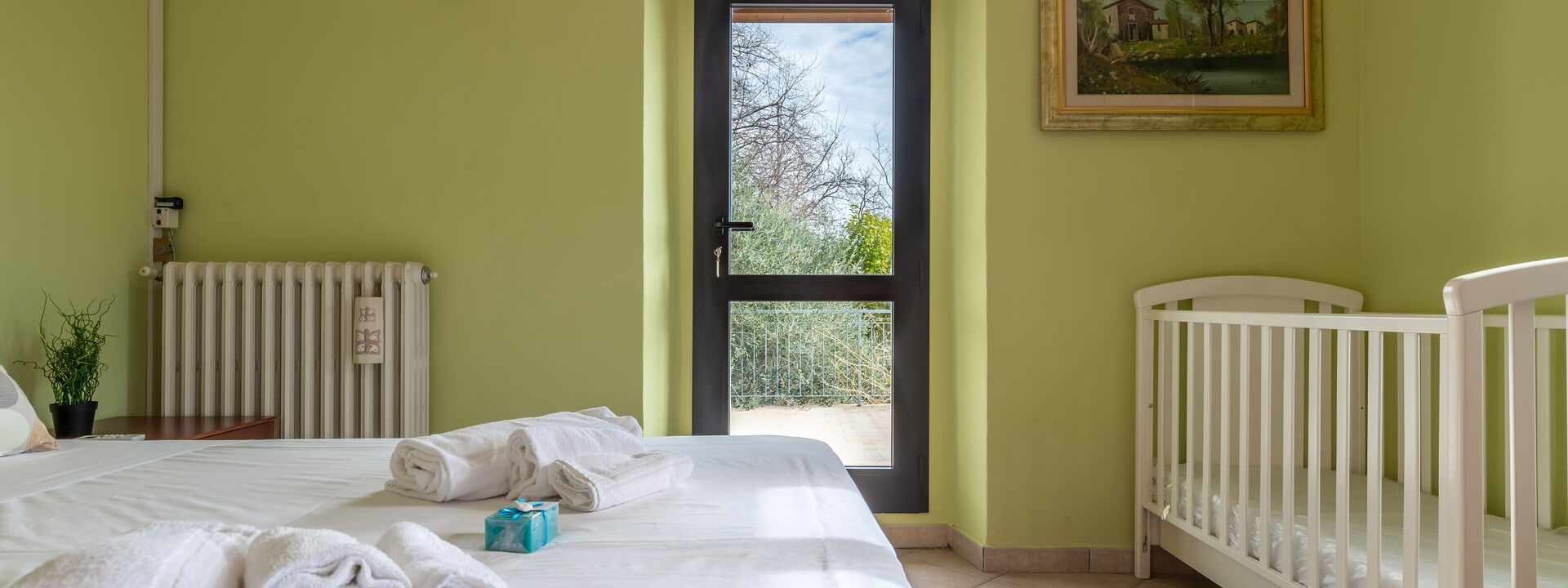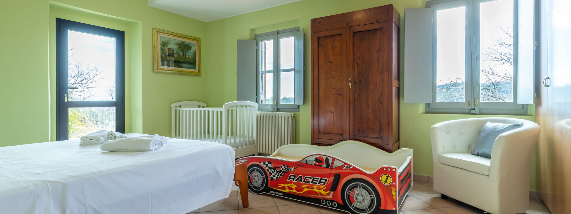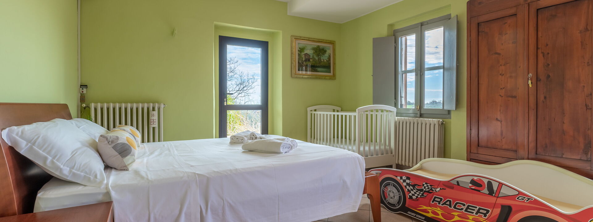 1 chambre double avec lit bébé et lit enfant