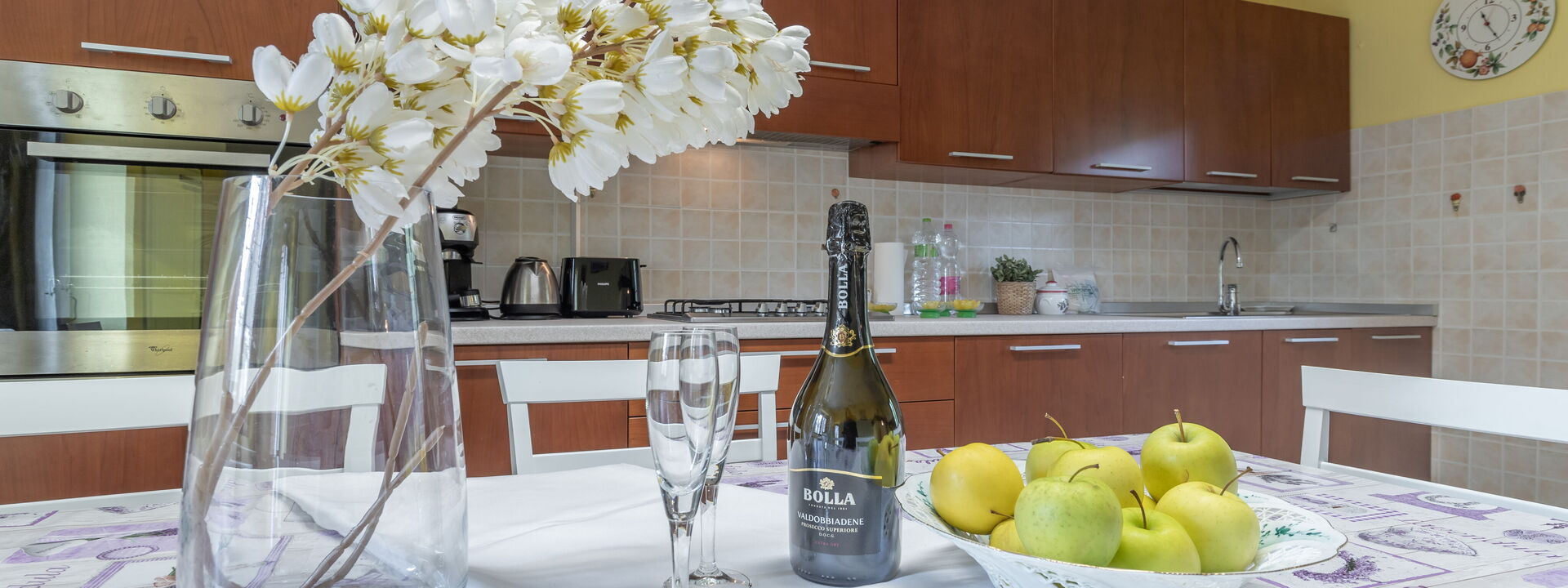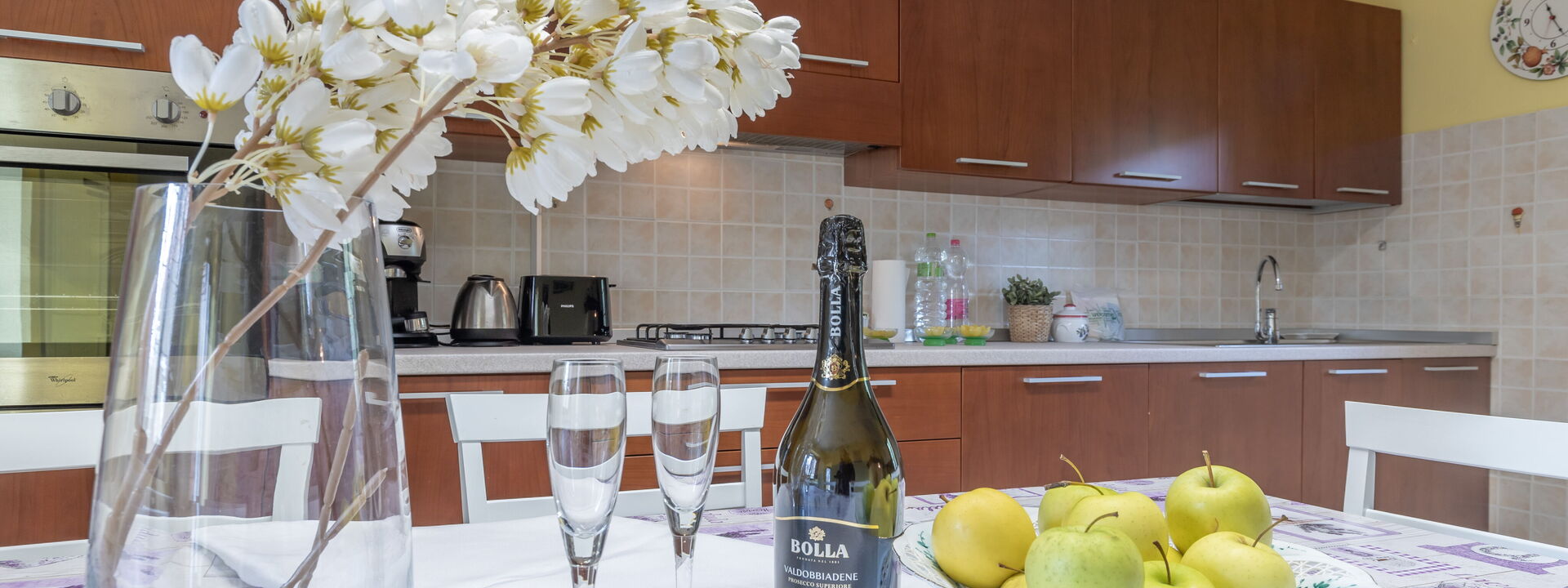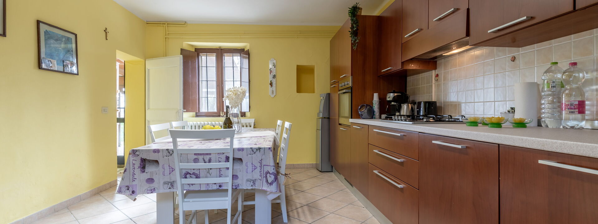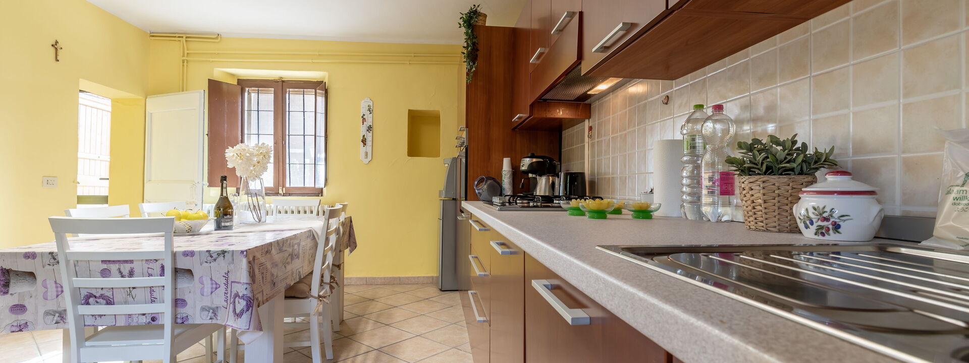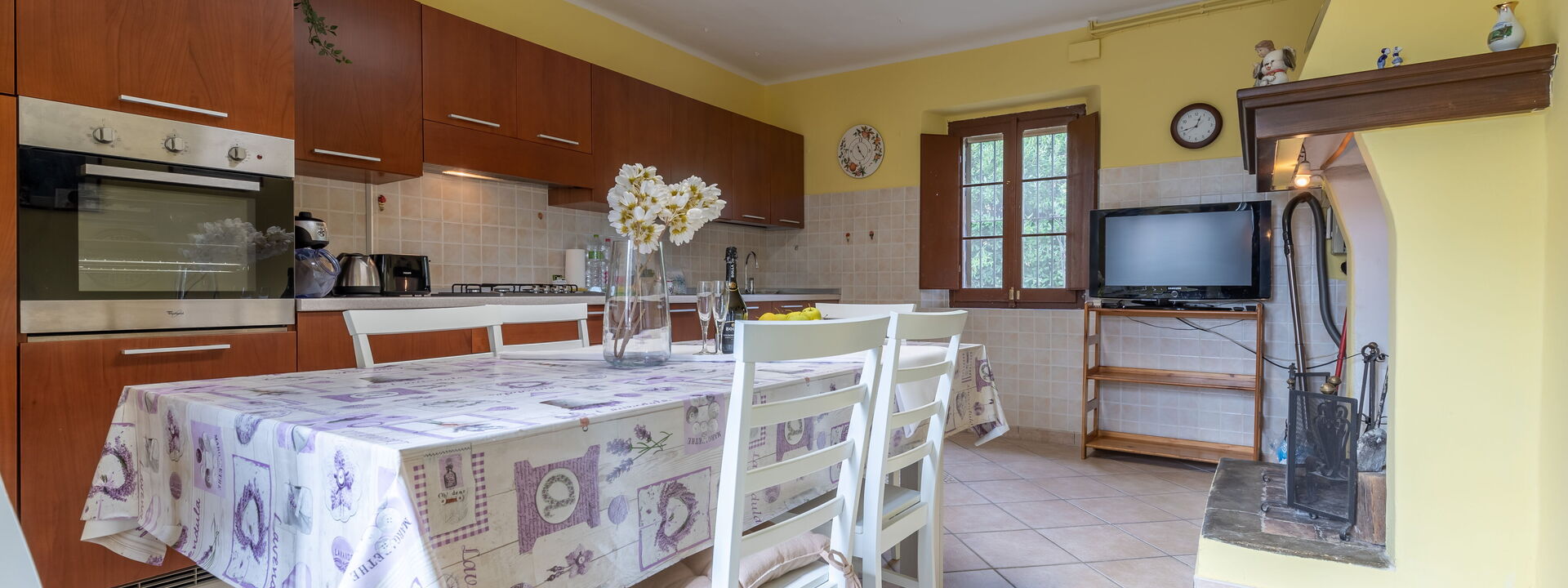 Cuisine entièrement équipée avec four électrique, plaque de cuisson cinq feux, réfrigérateur et congélateur, lave-vaisselle, micro-ondes, bouilloire, vaisselle et ustensiles