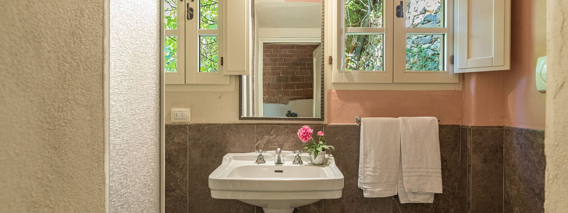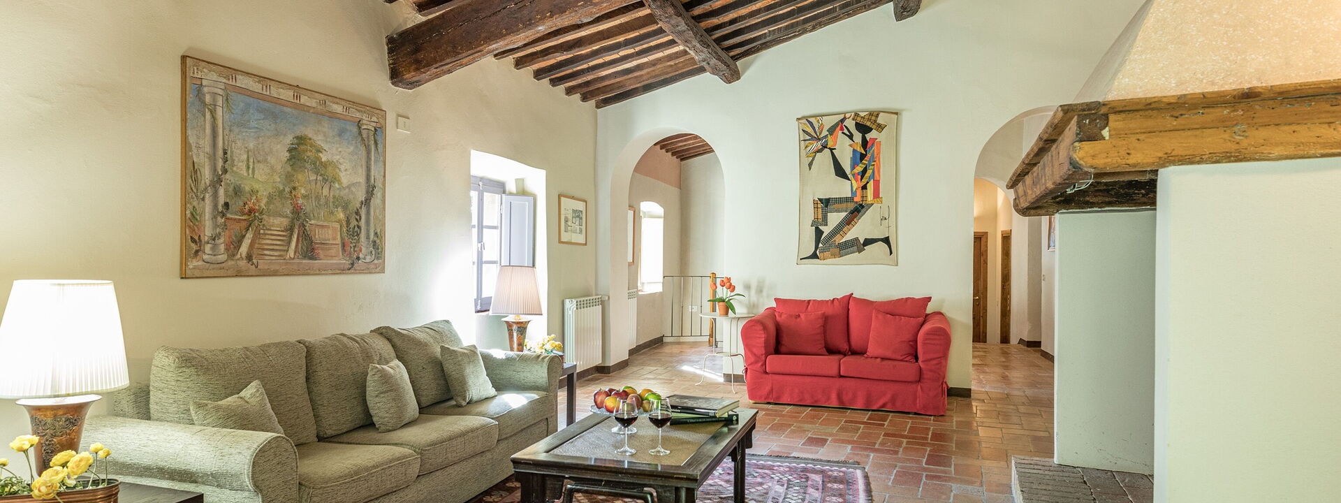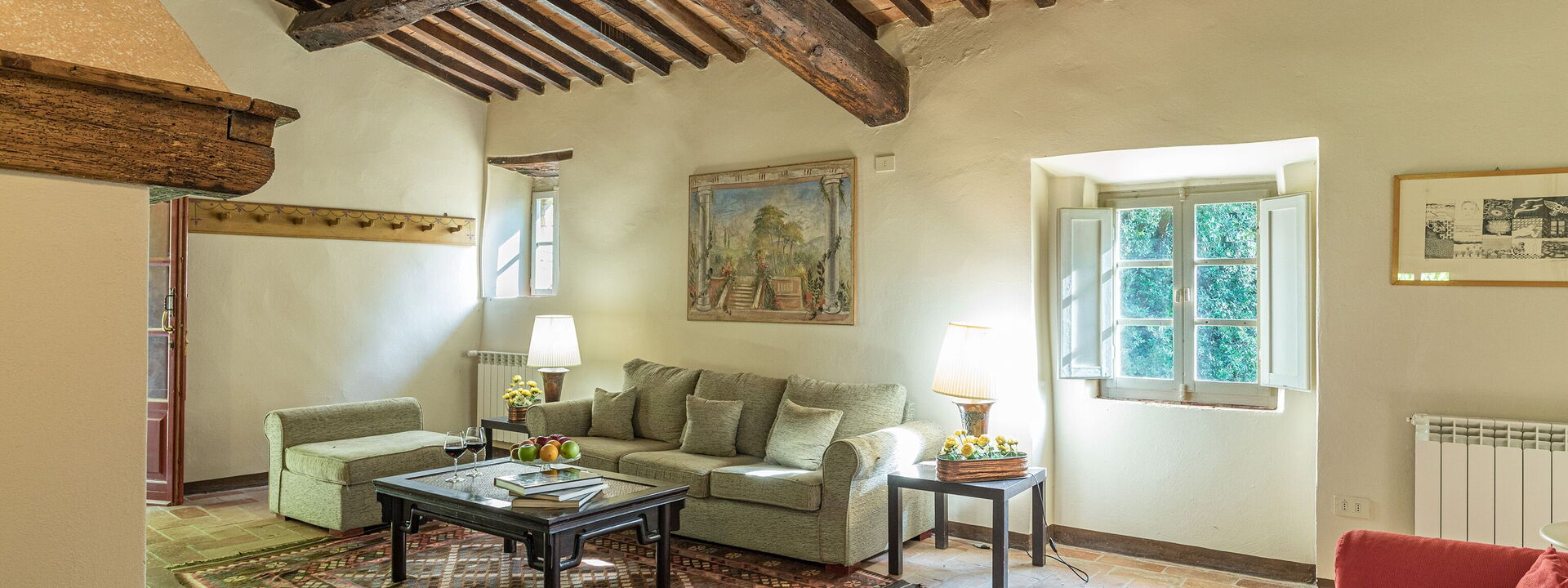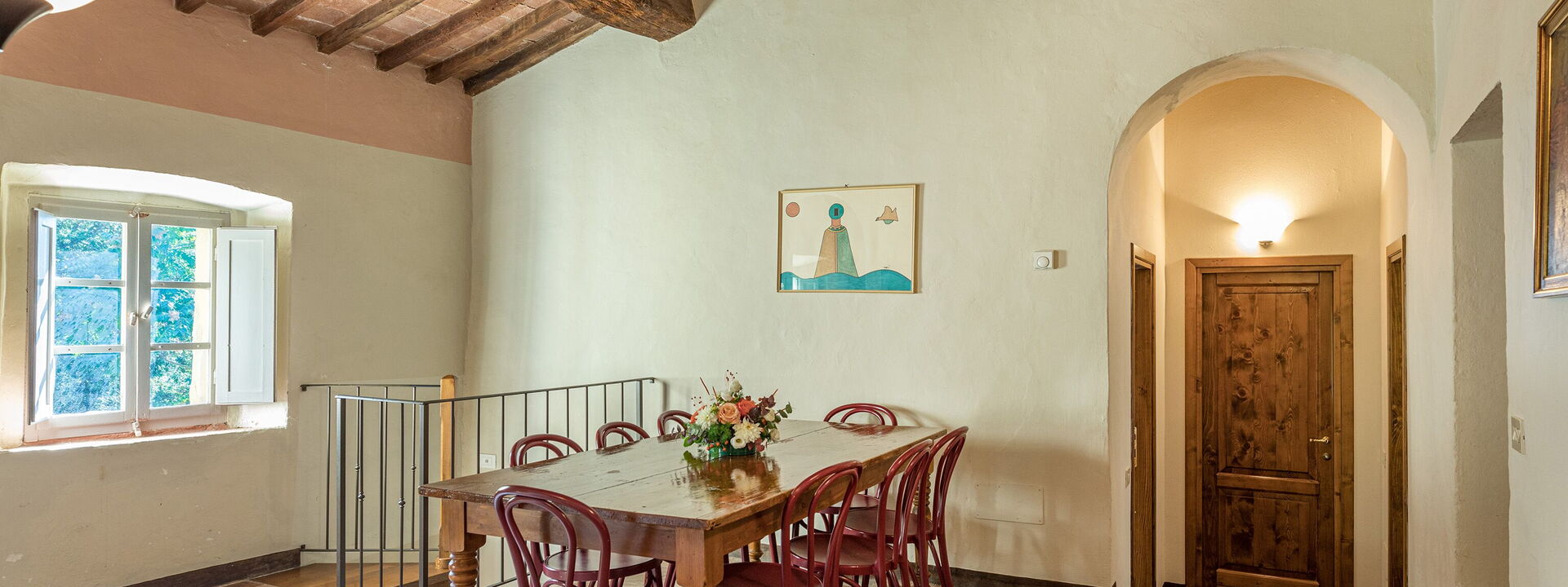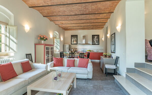 La ferme Linchiano forme une solution d'habitation unique avec la tour médiévale adjacente. Les deux structures sont situées dans une position d'une beauté extraordinaire et peuvent accueillir jusqu'à 14 personnes au total. Au rez-de-chaussée, la ferme Linchiano offre un grand salon, une salle à manger, une cuisine entièrement équipée, une chambre simple et deux chambres doubles, dont une avec salle de bain en suite. Les trois salles de bains ont toutes une douche, un lavabo, des toilettes et un bidet. Au premier étage, il y a deux salons dont un avec une grande cheminée, un bureau, une chambre double, deux chambres à deux lits et une buanderie. Les deux salles de bains, une avec baignoire/douche et l'autre avec douche uniquement, disposent d'un lavabo, de toilettes et d'un bidet.