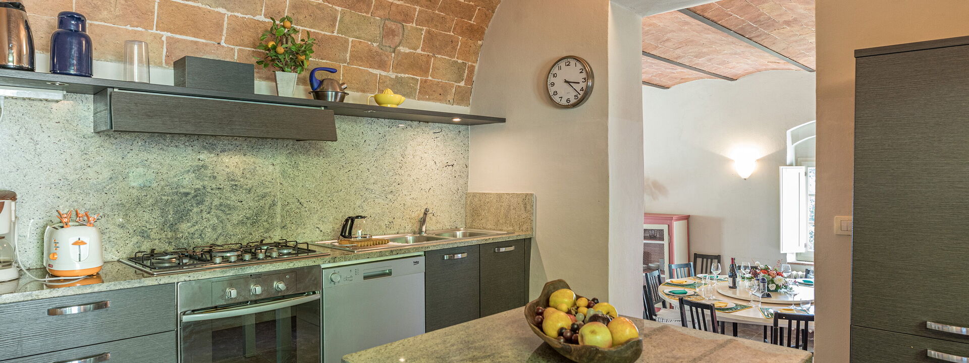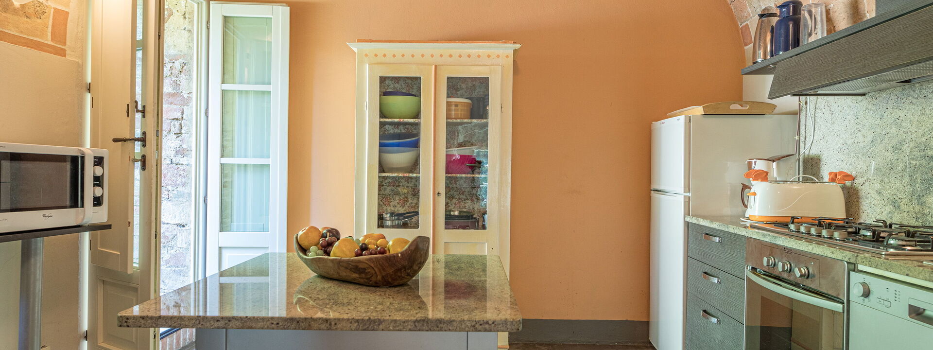 Cuisine entièrement équipée, avec lave-vaisselle, four micro-ondes, grille-pain, bouilloire, cafetière moka et machine à café américaine