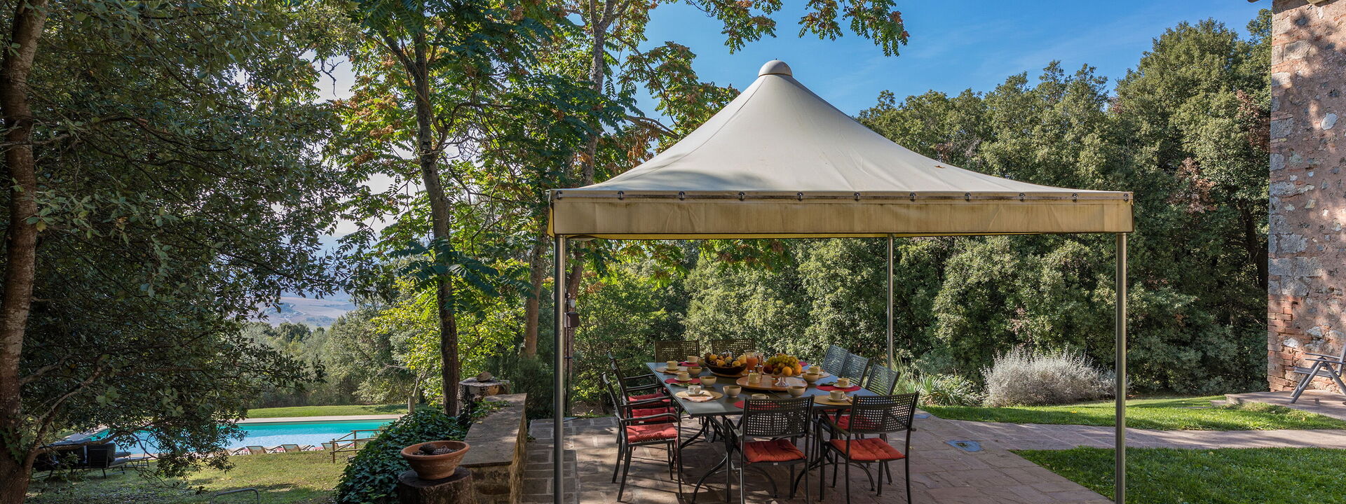 Villa Linchiano offre à ses hôtes un jardin privé exclusif avec une splendide piscine équipée de parasols et de chaises longues, entourée d'un magnifique espace vert équipé de table, chaises et barbecue.
