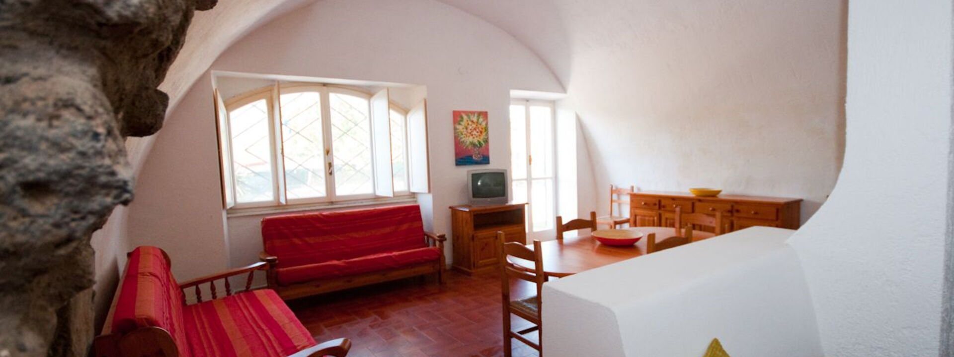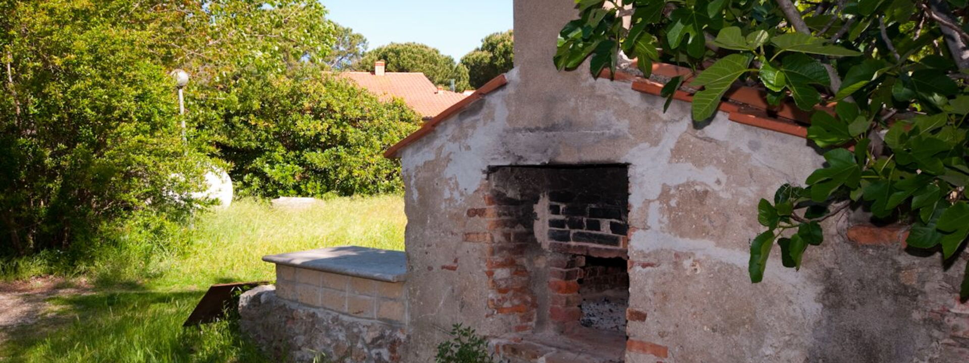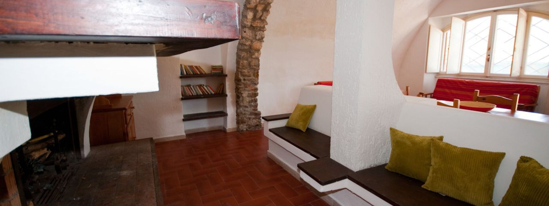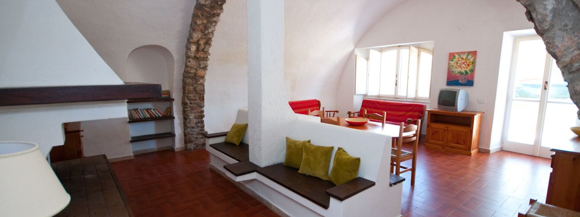 Le grand salon aux arcades en briques apparentes se caractérise par l'agréable espace détente avec cheminée meublée de canapés et fauteuils (2 canapés-lits); grande salle à manger avec table et chaises pour 10 personnes. Accès direct au jardin privé équipé de table et chaises d'extérieur.
