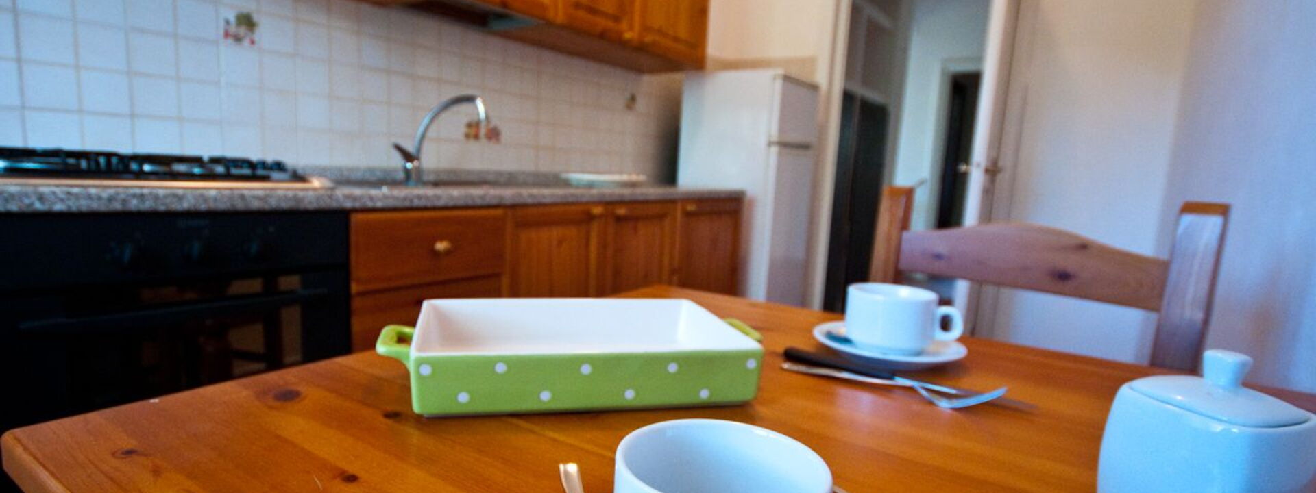 Cuisine en bois entièrement équipée avec ustensiles et vaisselle, réfrigérateur, congélateur, four, table et chaises