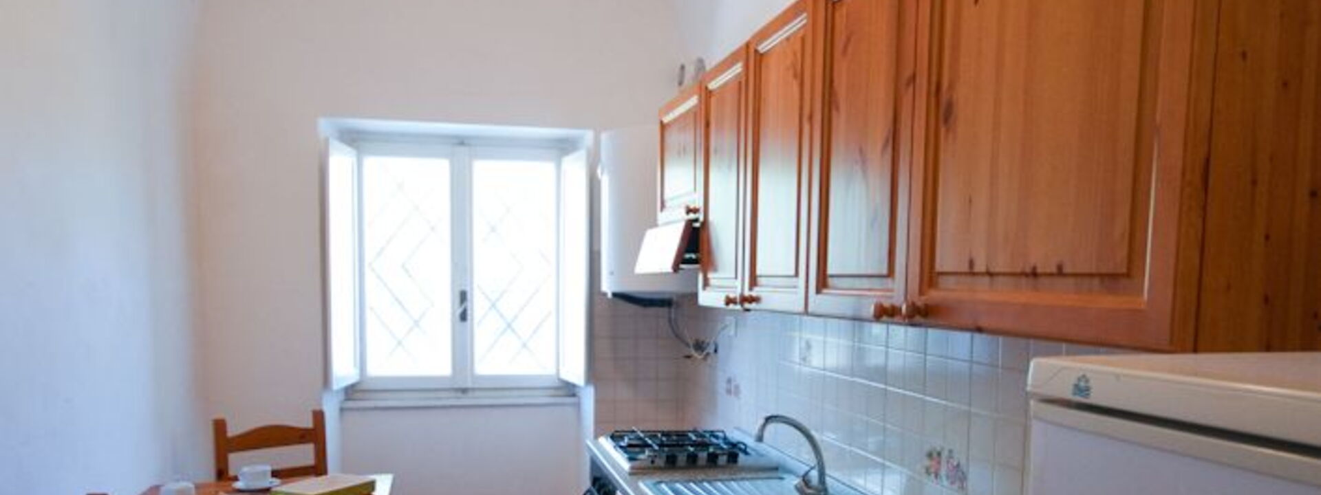 Cuisine en bois entièrement équipée avec ustensiles et vaisselle, réfrigérateur, table et chaises