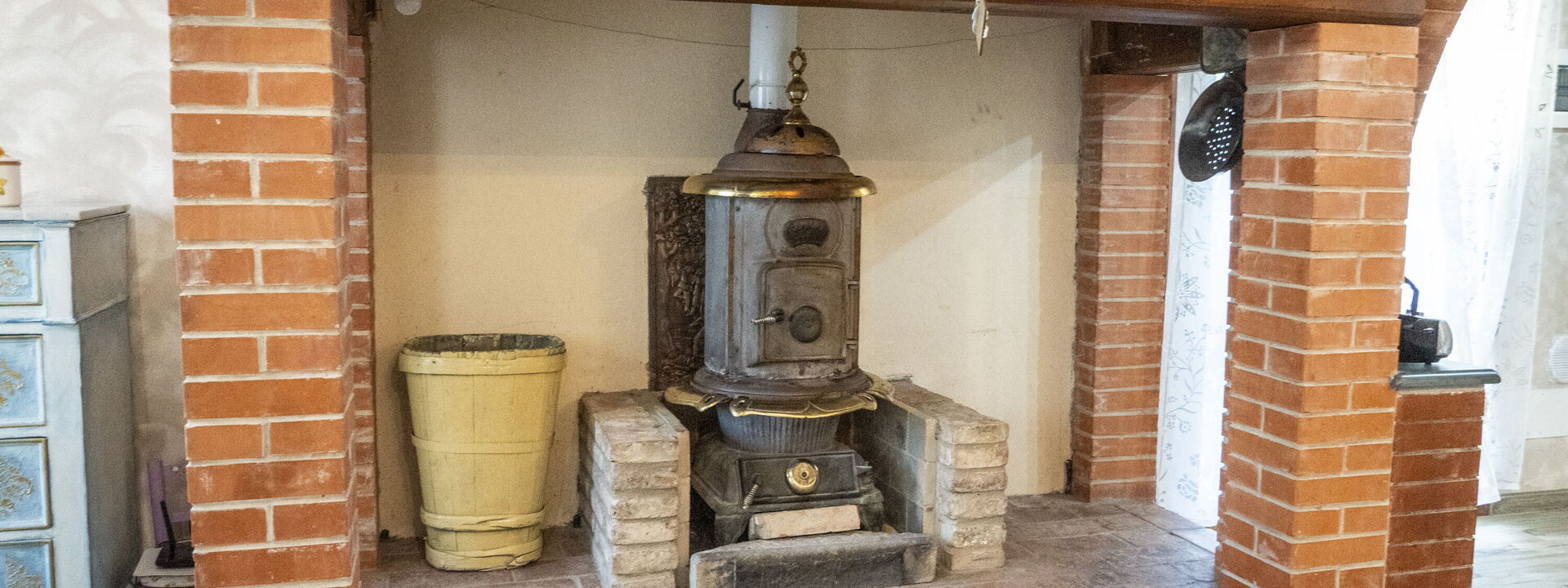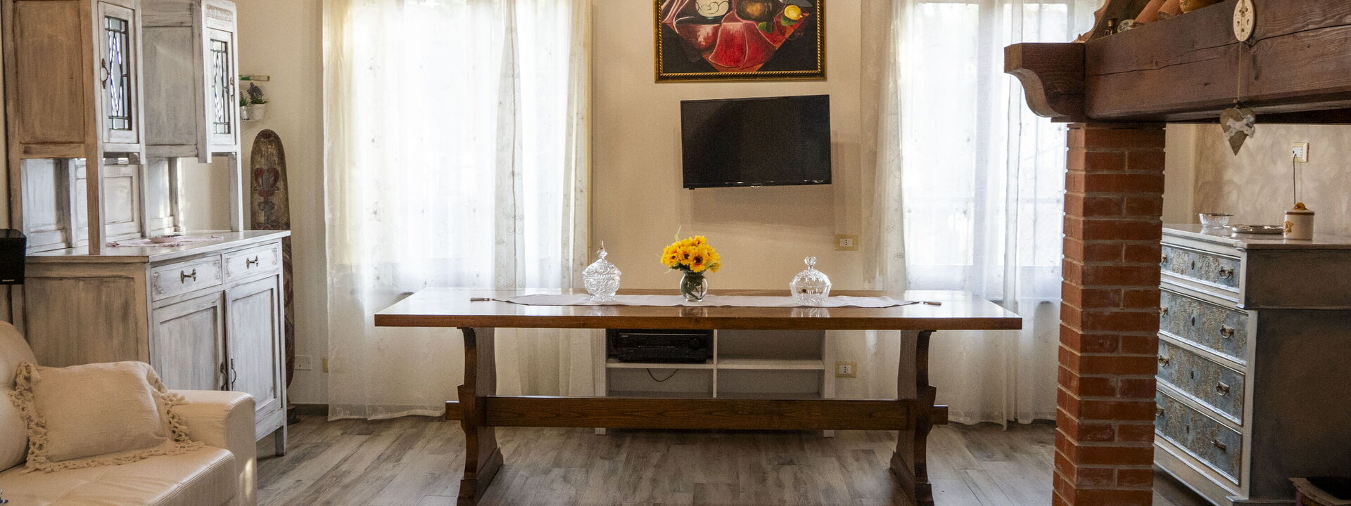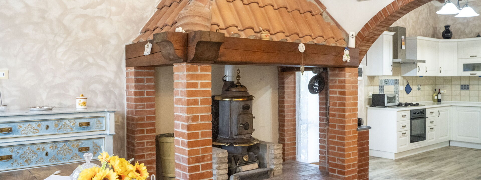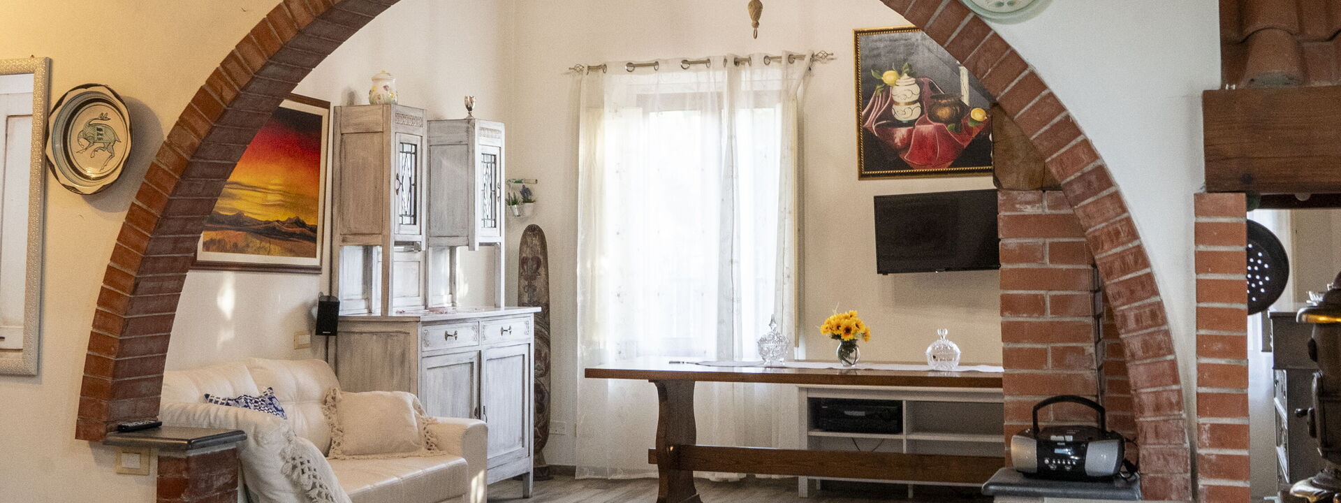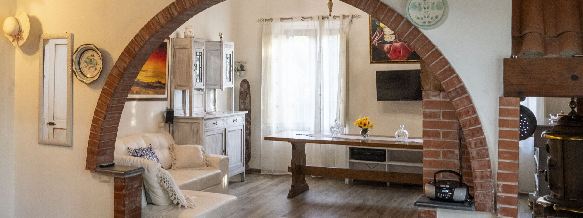 grande salone con caminetto, divano letto e tv, separata da un arco caratteristico a mattoncini vi è la cucina anch'essa molto ampia e luminosa dotata di tutti gli elettrodomestici e completa di attrezzatura per cucinare, compresi piatti, bicchieri e stoviglie