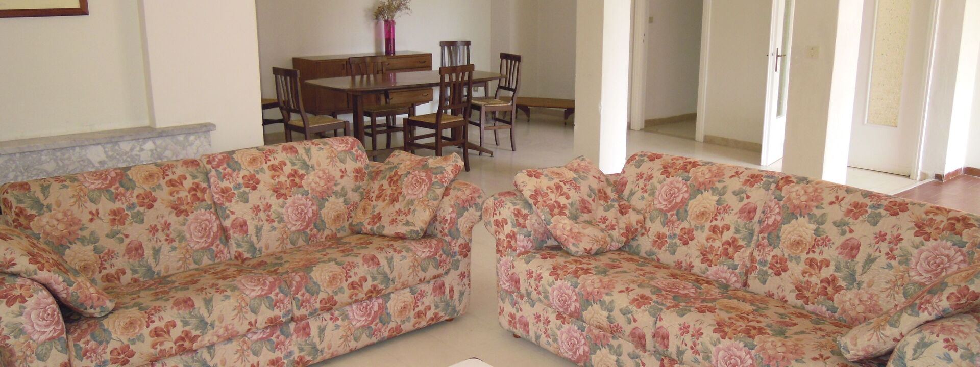 un ampio e luminoso soggiorno arredato con comodi divani, tavolo, sedie e TV, dal quale si accede al terrazzo.
