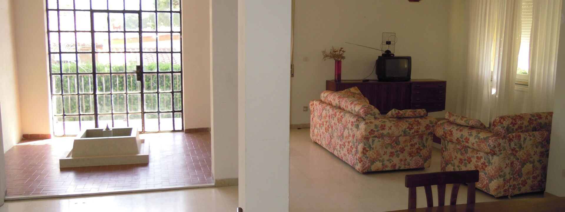 un ampio e luminoso soggiorno arredato con comodi divani, tavolo, sedie e TV, dal quale si accede al terrazzo fronte mare.