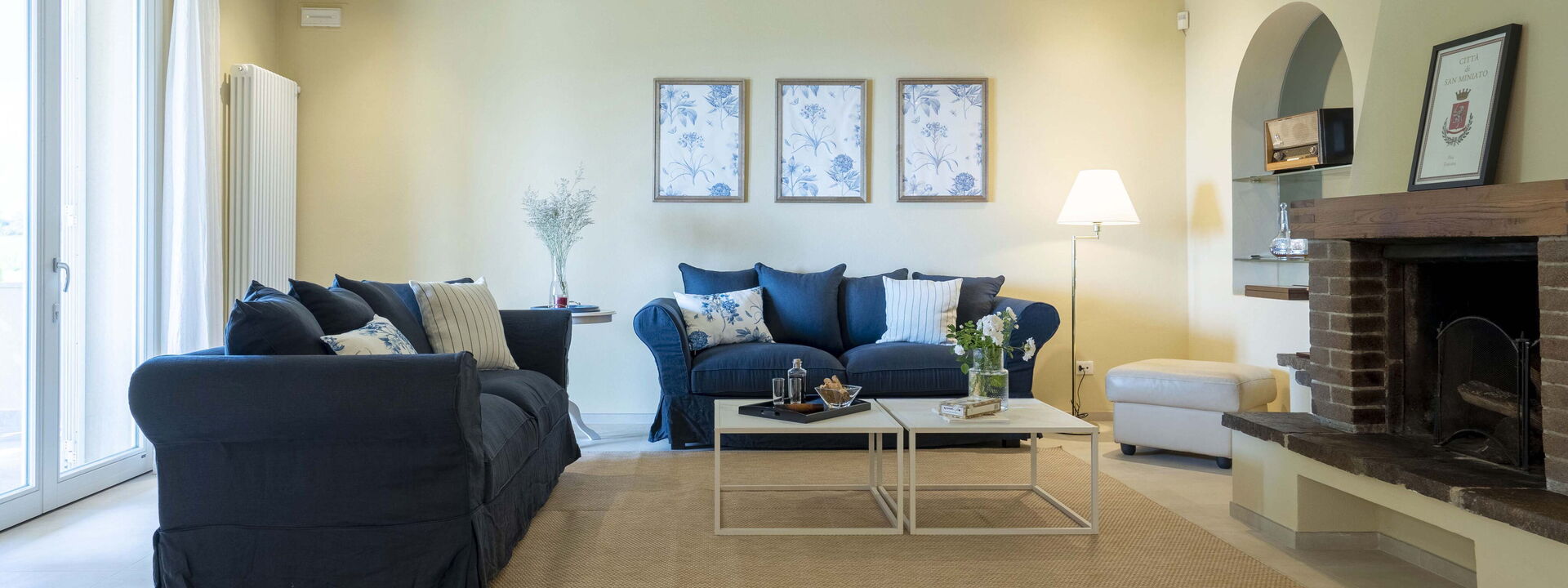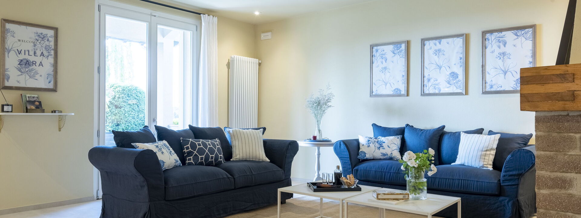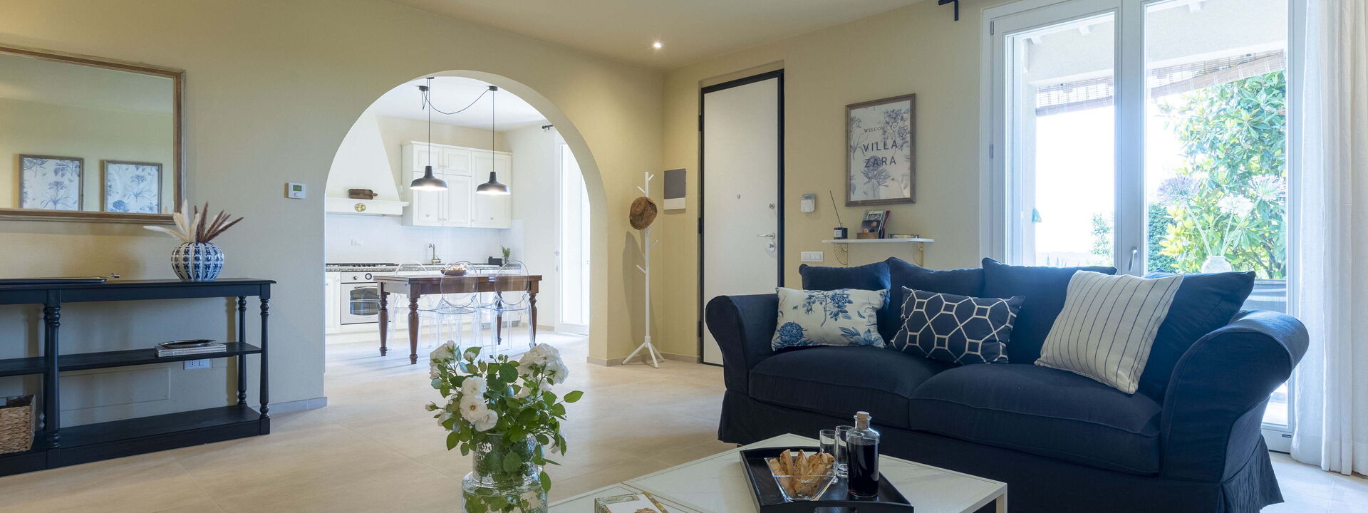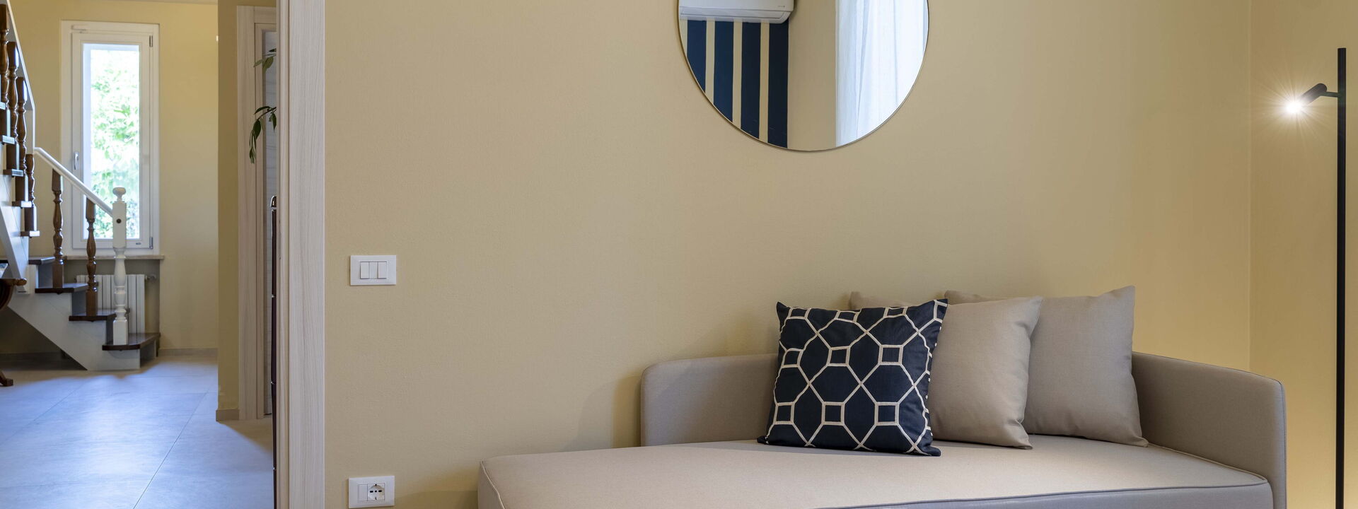 Ingresso nel soggiorno con divano letto, poltrone e tavolini