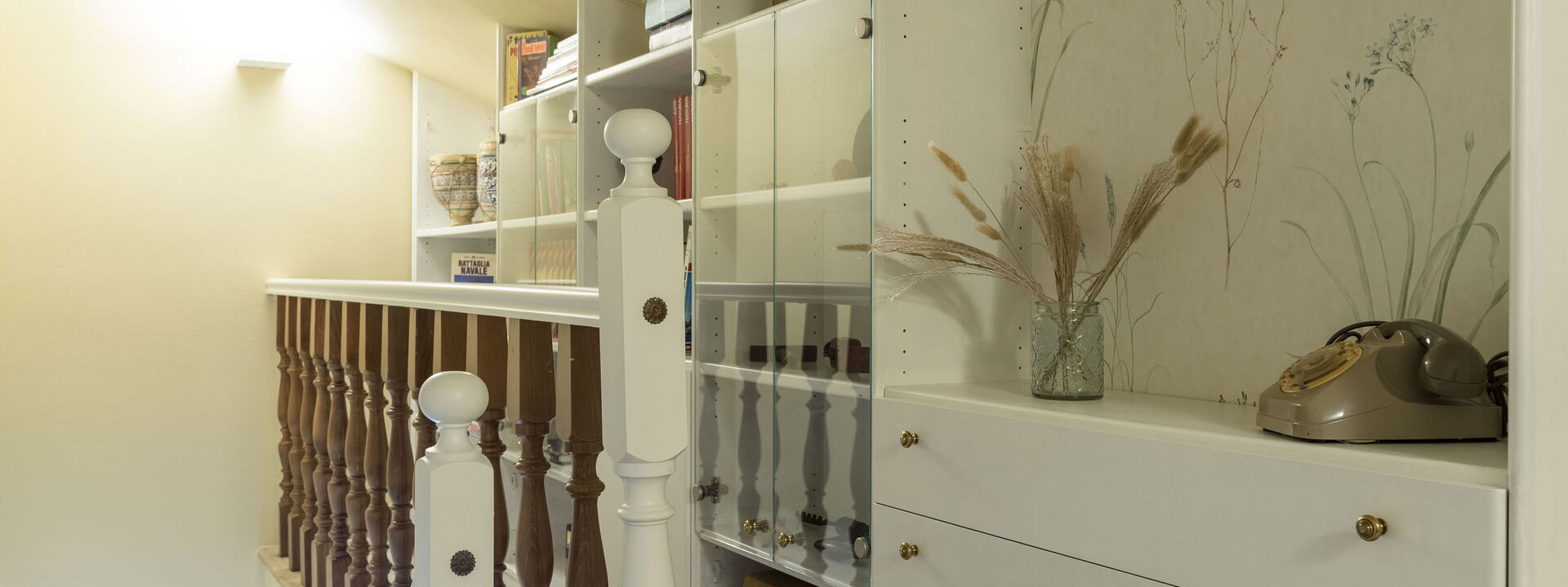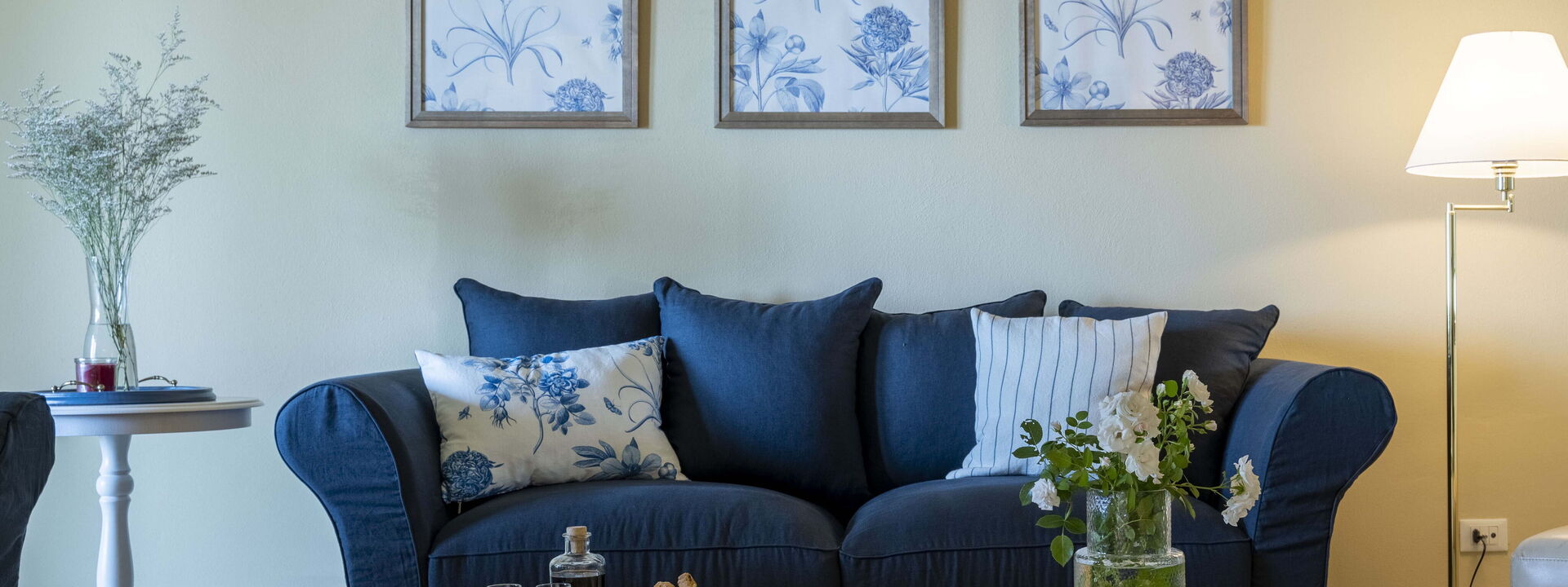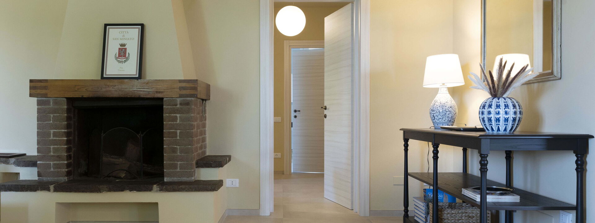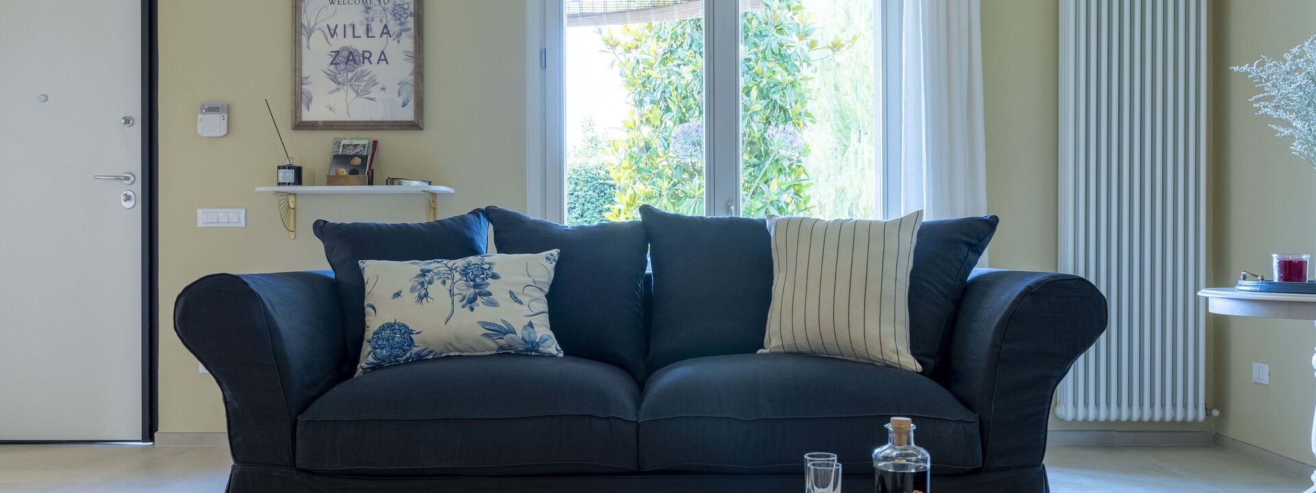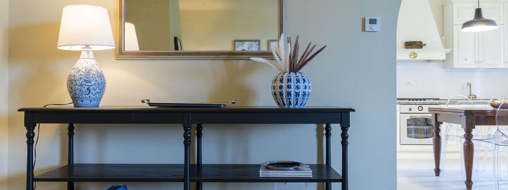 Ingresso nel soggiorno con divano letto, poltrone e tavolini