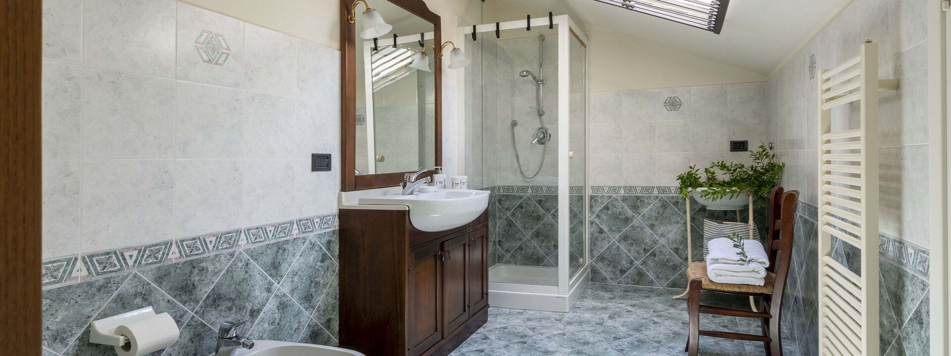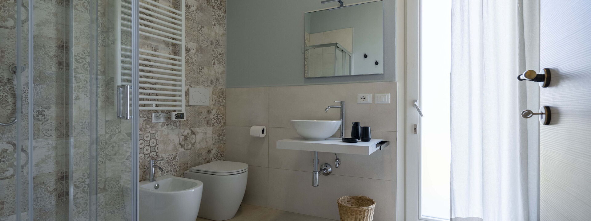 1 bagno completo dotato di porta finestra con lavabo, servizi, box doccia e bidet