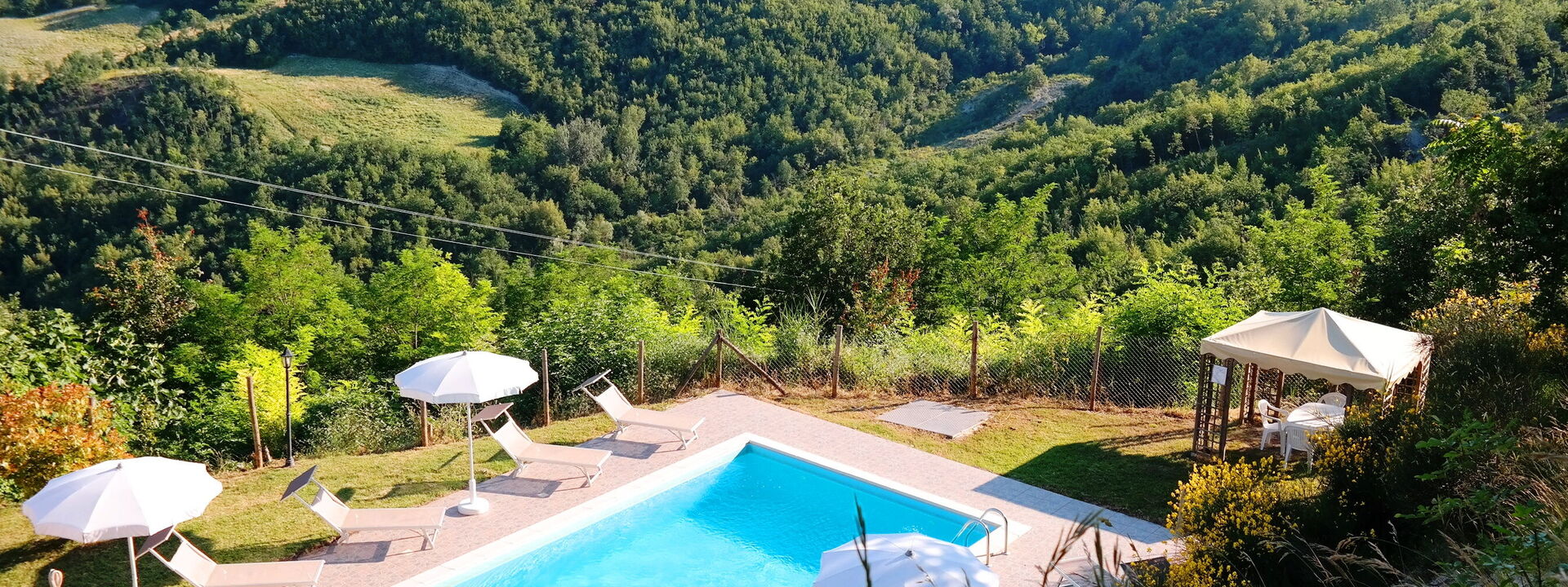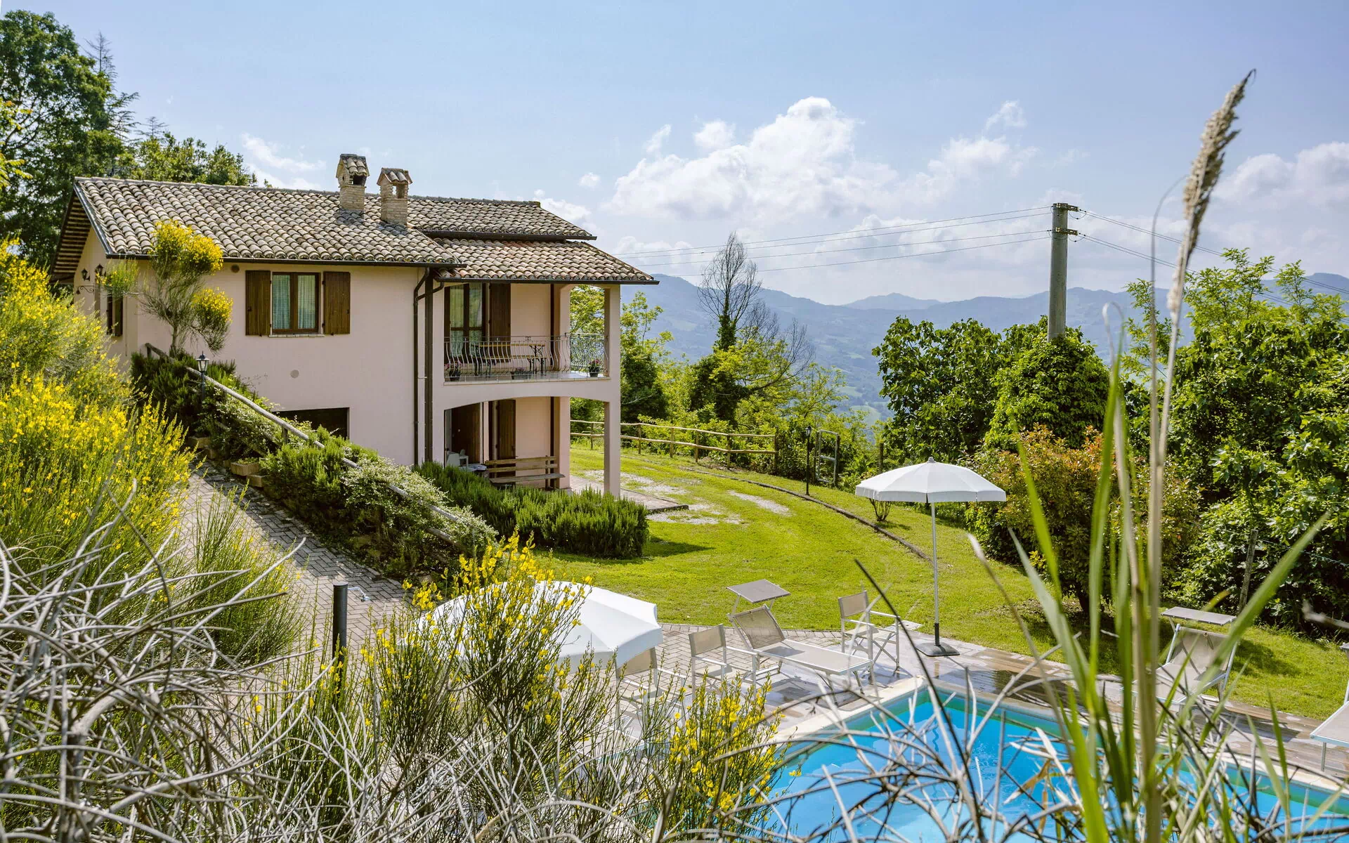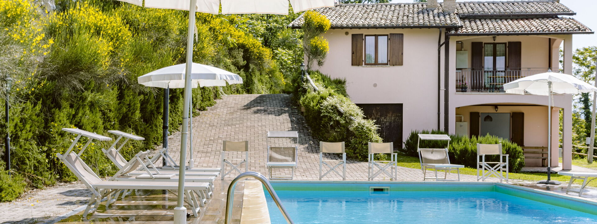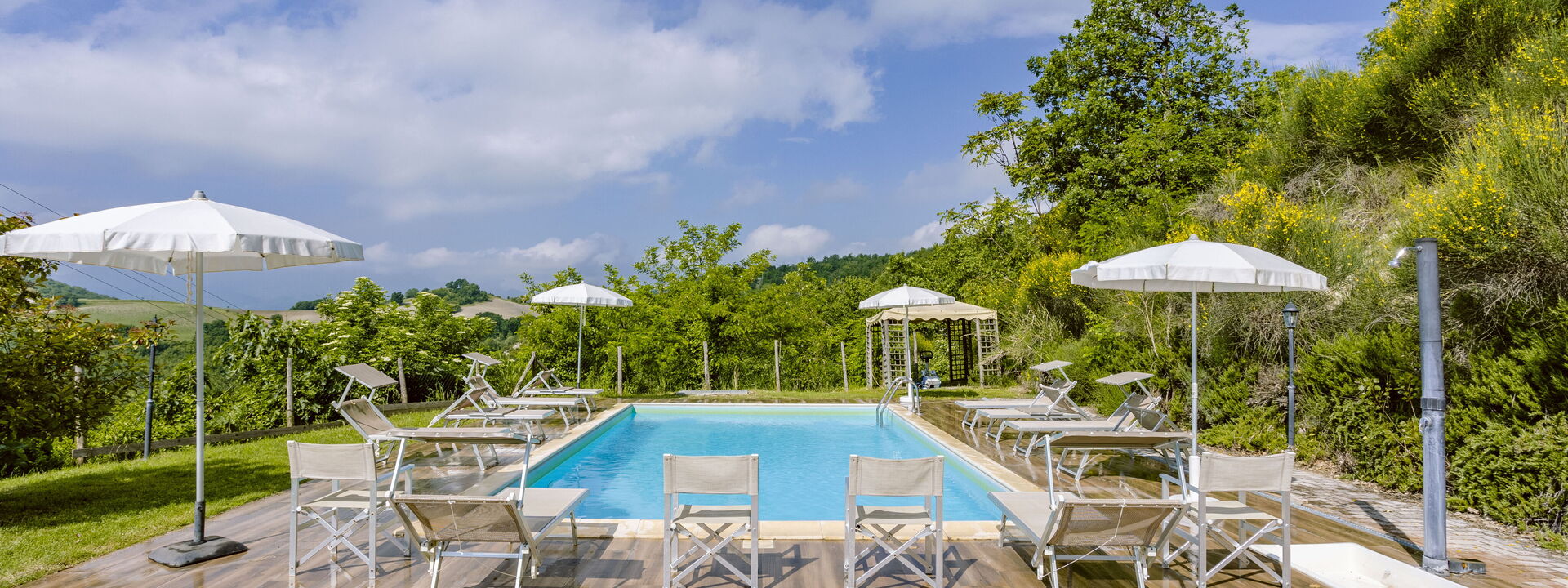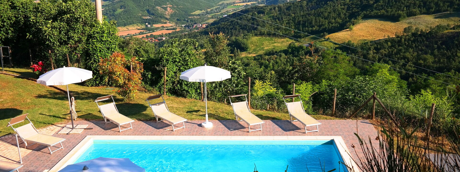 The swimming pool at Villa Altavista offers a breathtaking view over the surrounding hills and mountains. Equipped with comfortable sun loungers and umbrellas, it is the perfect place to relax under the sun. An exclusive corner where beauty and comfort meet for unforgettable moments.