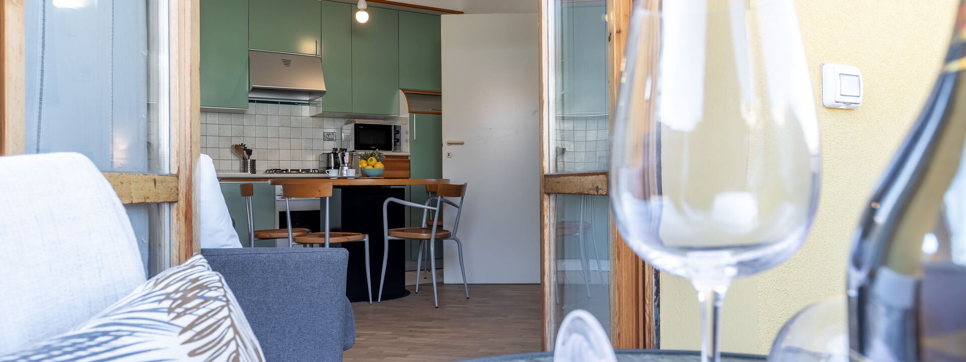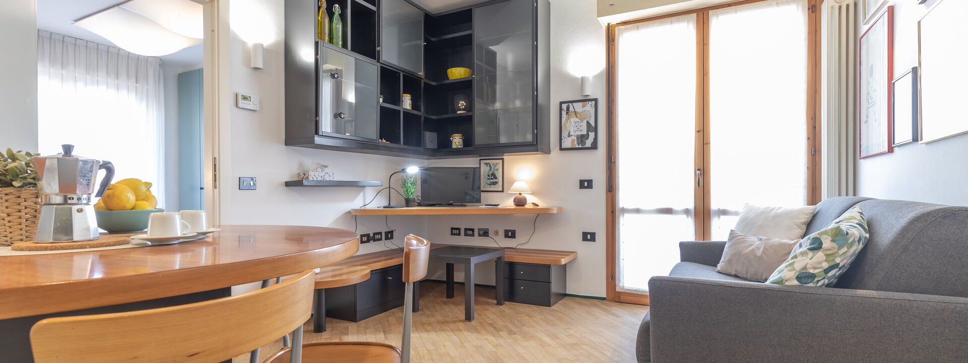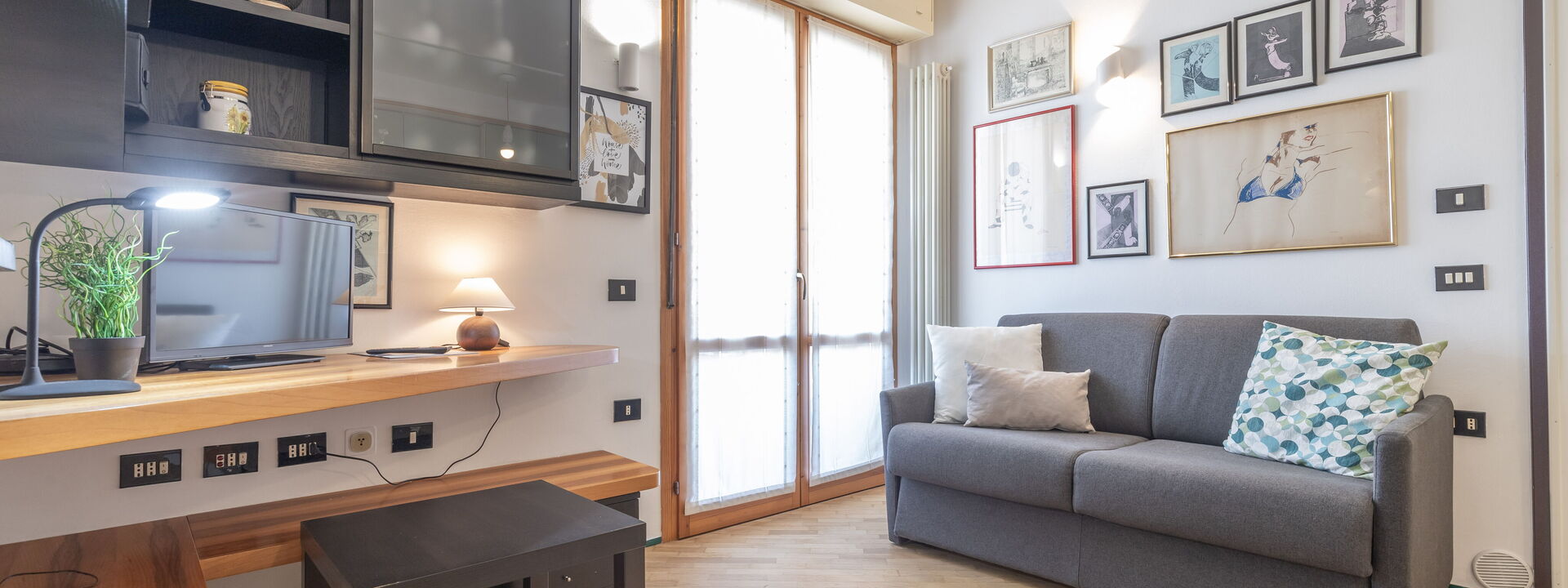 open space living area with double sofa bed, coffee table and satellite TV, French window with access to the small terrace equipped with table and chairs