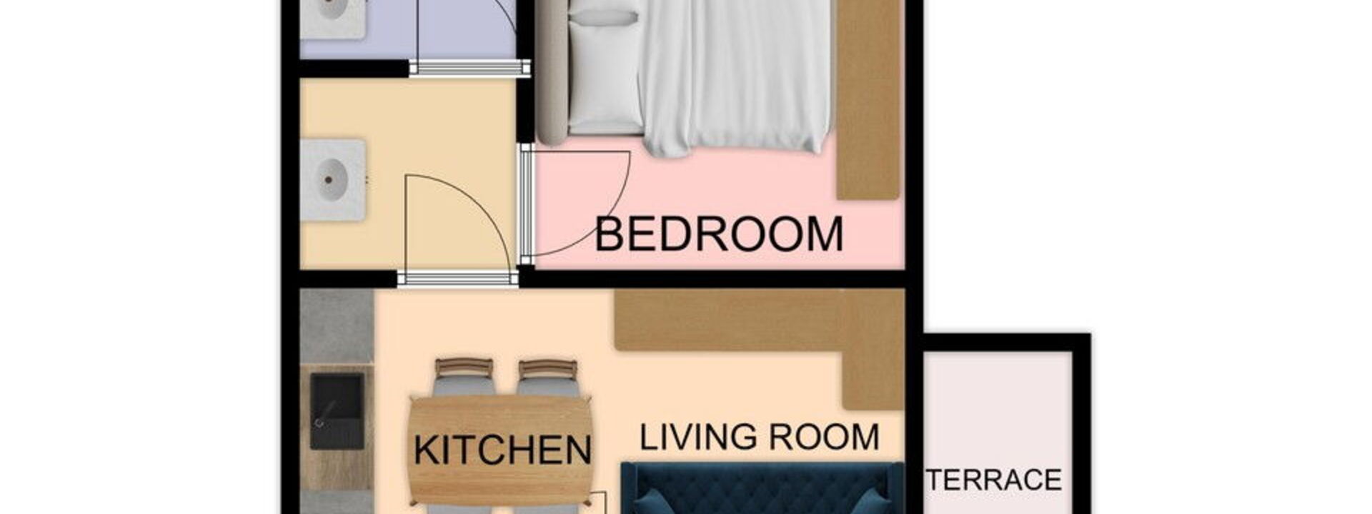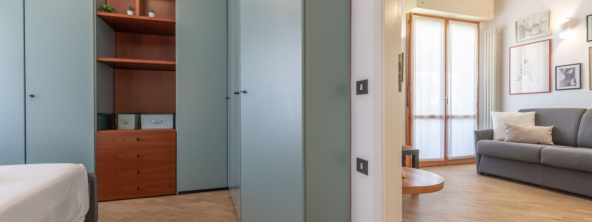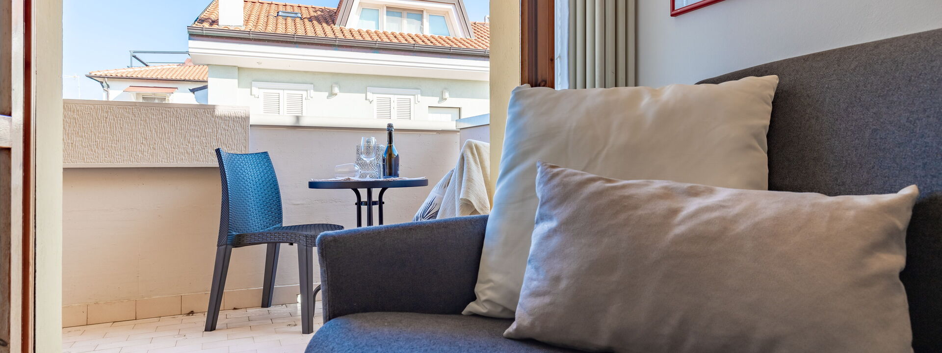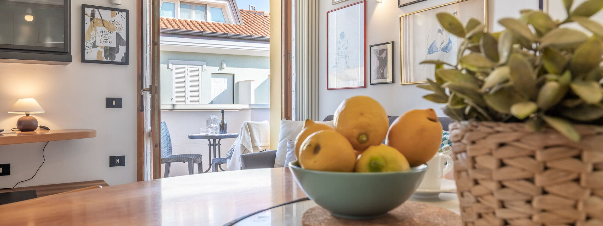 open space living area with double sofa bed, coffee table and satellite TV, French window with access to the small terrace equipped with table and chairs