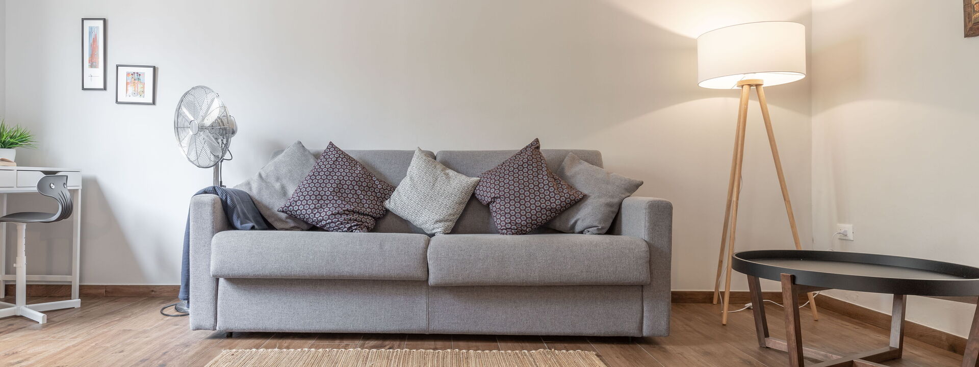 open space living area with double sofa bed, coffee table and satellite TV