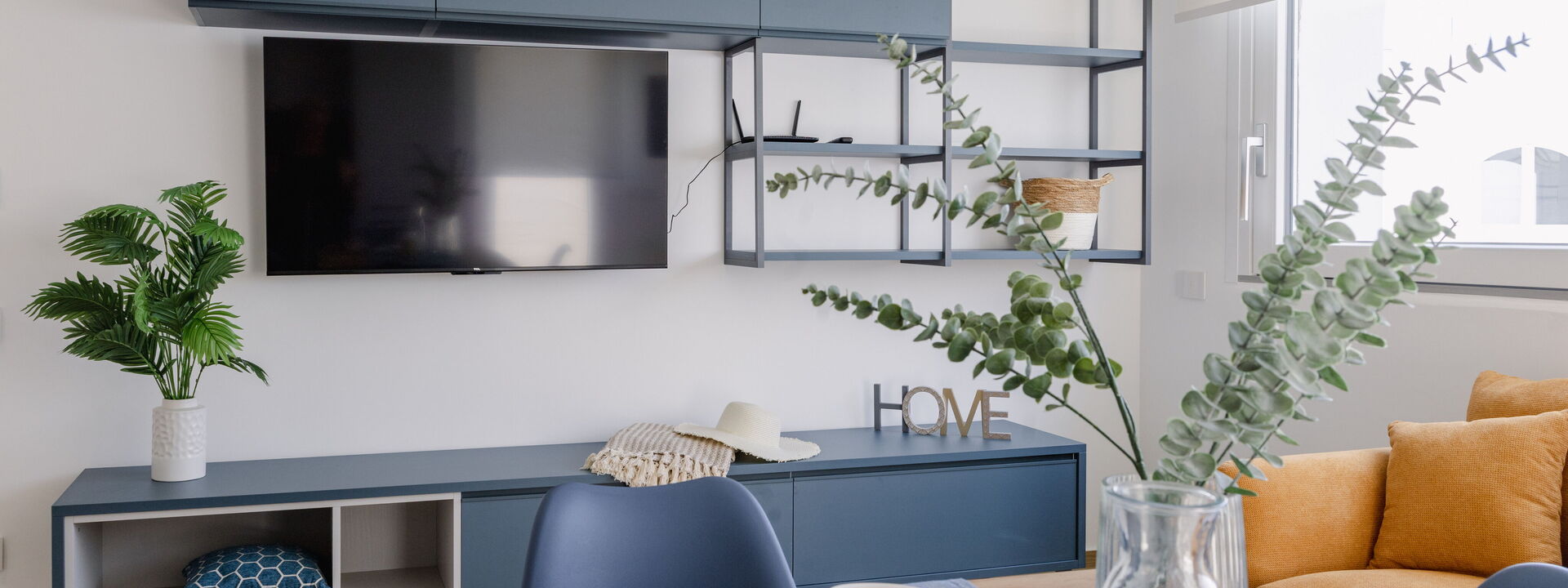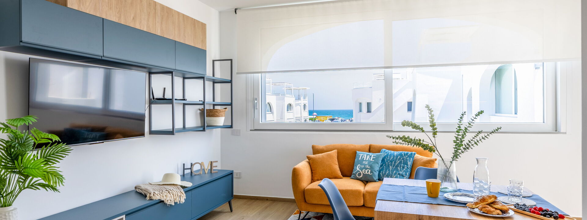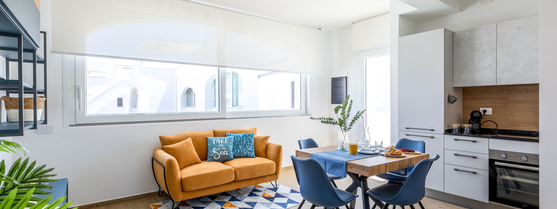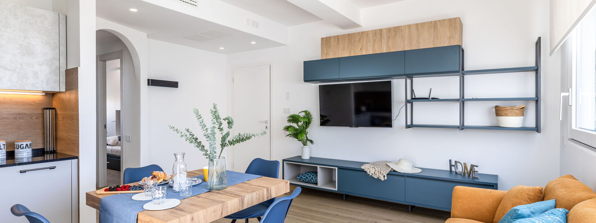 open space with fully equipped kitchen, living room with TV, dining table and sofa