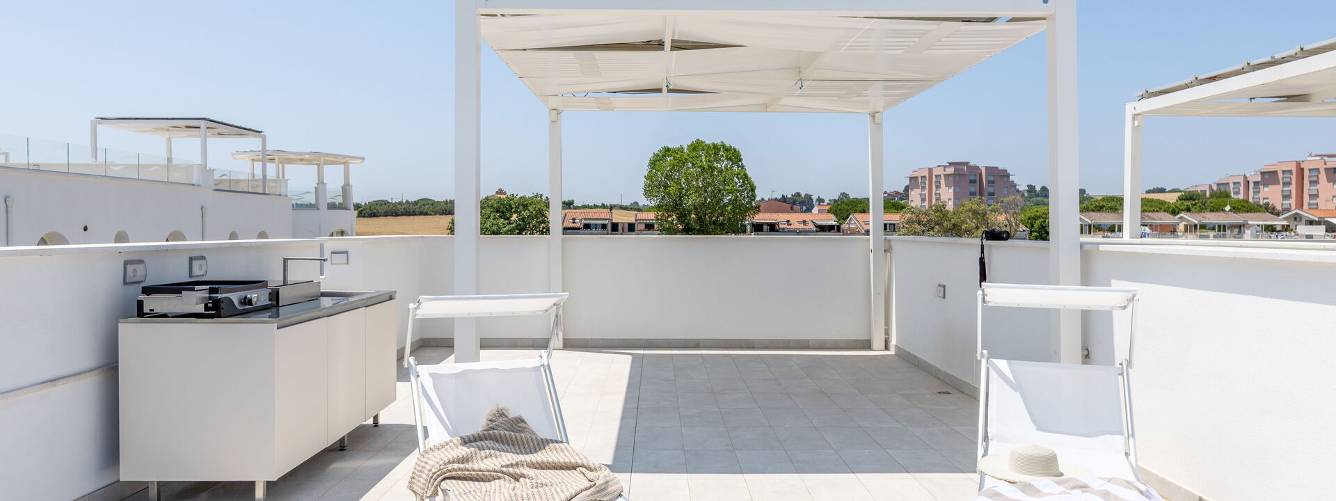 Panoramic roof terrace equipped with kitchenette, dining table and solarium corner