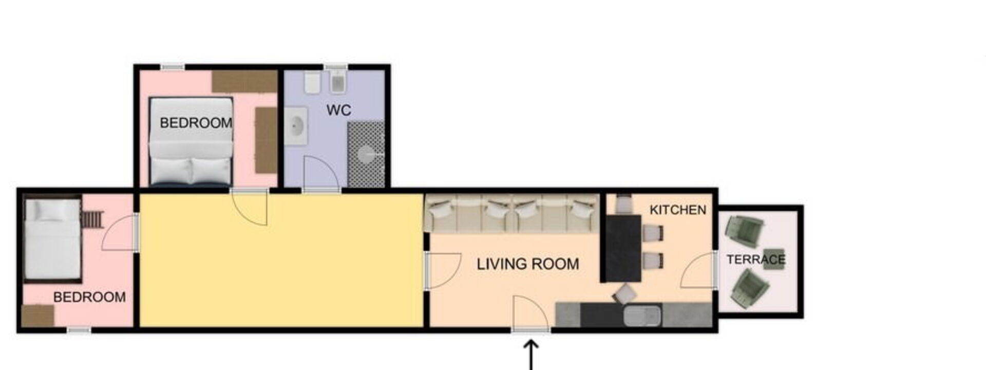 - open space with kitchen equipped with dishwasher, table for 6 people and a sofa that can become a bed