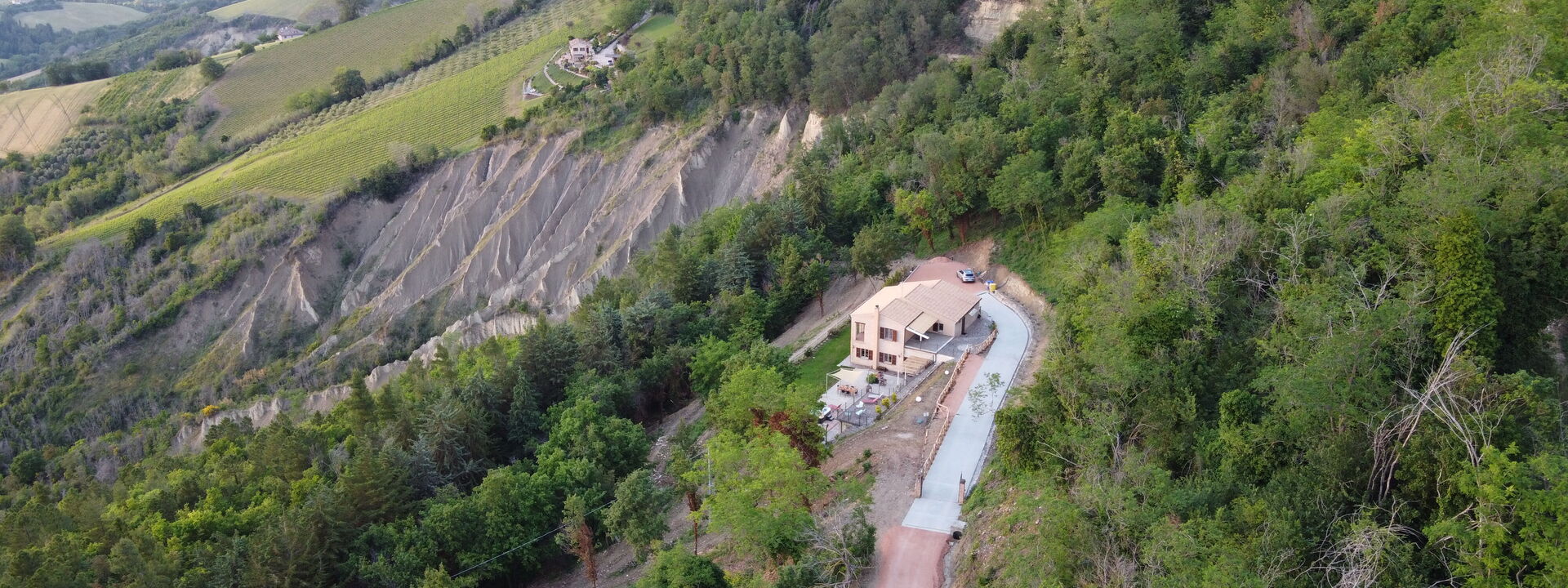 Guests can also explore the surrounding woods and walk among the trees and vineyards, with sweeping views of the gullies.