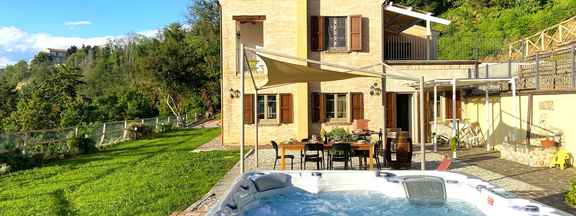 Surrounded by a large private garden, the house accommodates up to 16 guests on two floors, making it ideal for family vacations, groups of friends, or small retreats. The well-maintained outdoor spaces include relaxation areas, a shaded gazebo, an outdoor dining area, and a 6-person hot tub, for moments of pure well-being surrounded by nature.