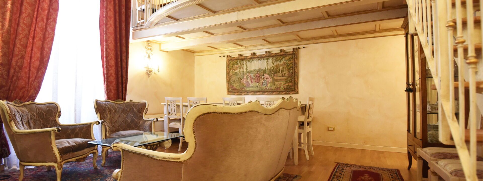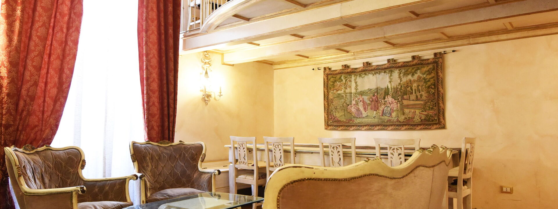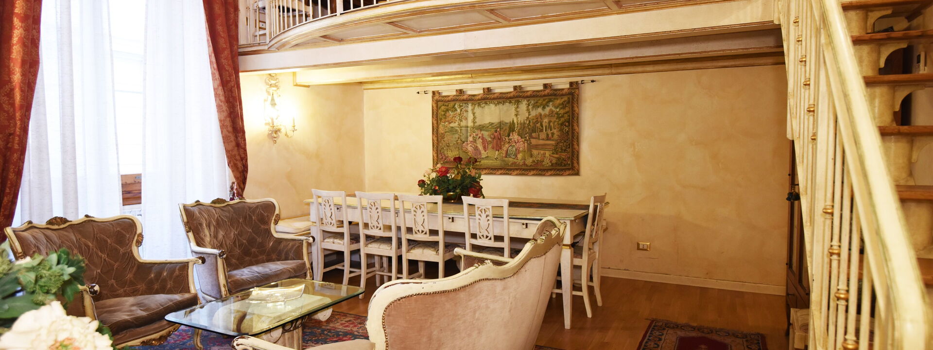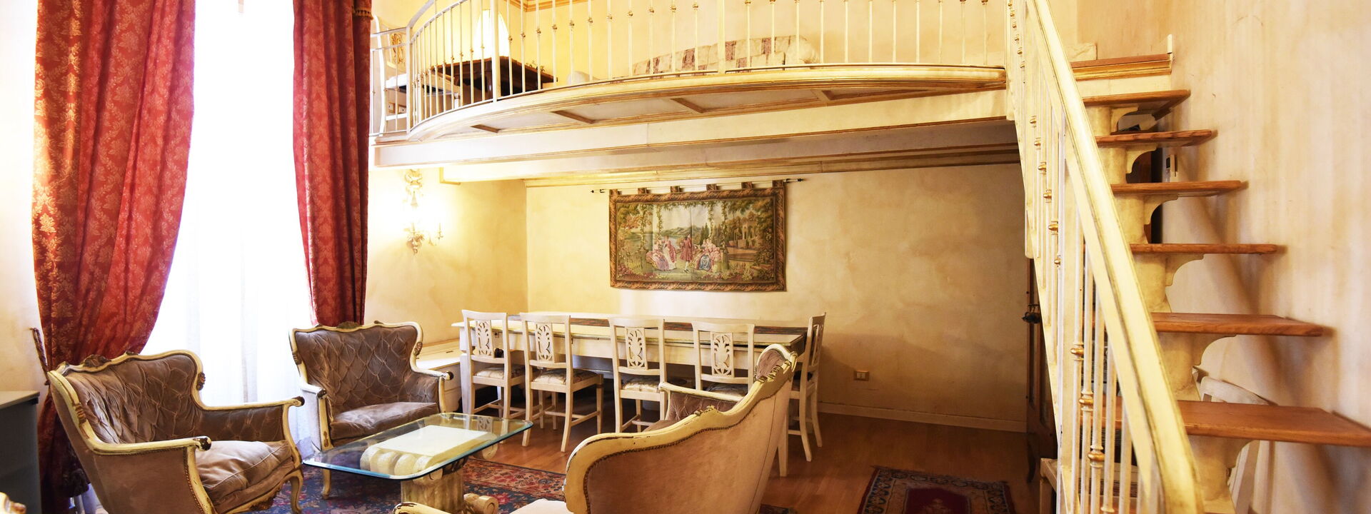 The living area consists of a large living room with a dining table to enjoy some intimate and private dinner, a comfortable three-seater sofa and two Florentine-style armchairs in the center, satellite TV, DVD player, and a large wooden dining table solid chest-decorated benches and chairs for 12 seats; a small staircase leads to a mezzanine decorated in wood with a sofa in Florentine embroidery which, if necessary, can become a sofa bed. In case you need to work during your stay here you will also find a comfortable study corner set up with a desk / desk, comfortable chair, table with printer, slippers for multi electrical outlets, cables and adapters, portable and folding laptop table that you can use for desk, bed, sofa or armchair, lamp with adjustable light and external monitor at your disposal. If you open the retractable glass door with typical Florentine decorations you will find the fully equipped kitchen fully equipped with a 4-burner hob, microwave oven, electric oven, fridge with freezer, dishwasher, American coffee machine and mocha coffee maker, griddle electric, dishes and utensils, electric kettle.