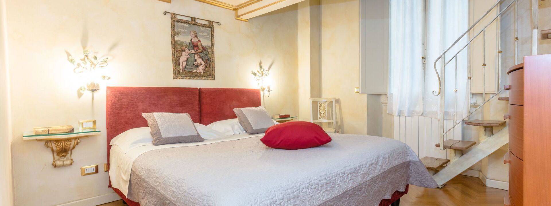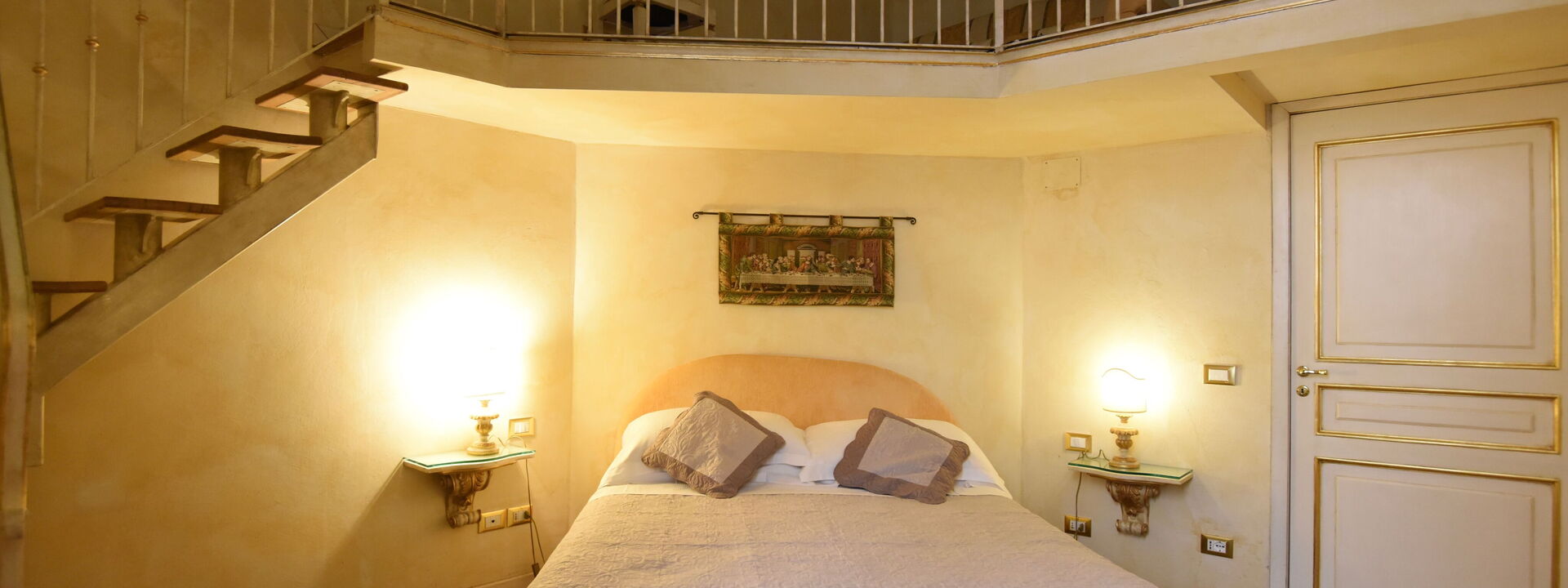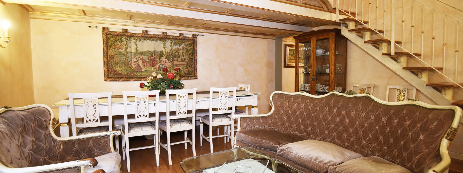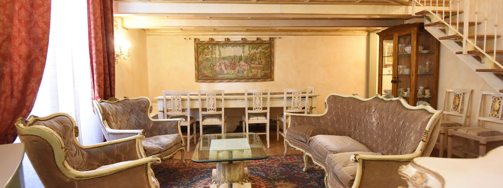 The living area consists of a large living room with a dining table to enjoy some intimate and private dinner, a comfortable three-seater sofa and two Florentine-style armchairs in the center, satellite TV, DVD player, and a large wooden dining table solid chest-decorated benches and chairs for 12 seats; a small staircase leads to a mezzanine decorated in wood with a sofa in Florentine embroidery which, if necessary, can become a sofa bed. In case you need to work during your stay here you will also find a comfortable study corner set up with a desk / desk, comfortable chair, table with printer, slippers for multi electrical outlets, cables and adapters, portable and folding laptop table that you can use for desk, bed, sofa or armchair, lamp with adjustable light and external monitor at your disposal. If you open the retractable glass door with typical Florentine decorations you will find the fully equipped kitchen fully equipped with a 4-burner hob, microwave oven, electric oven, fridge with freezer, dishwasher, American coffee machine and mocha coffee maker, griddle electric, dishes and utensils, electric kettle.