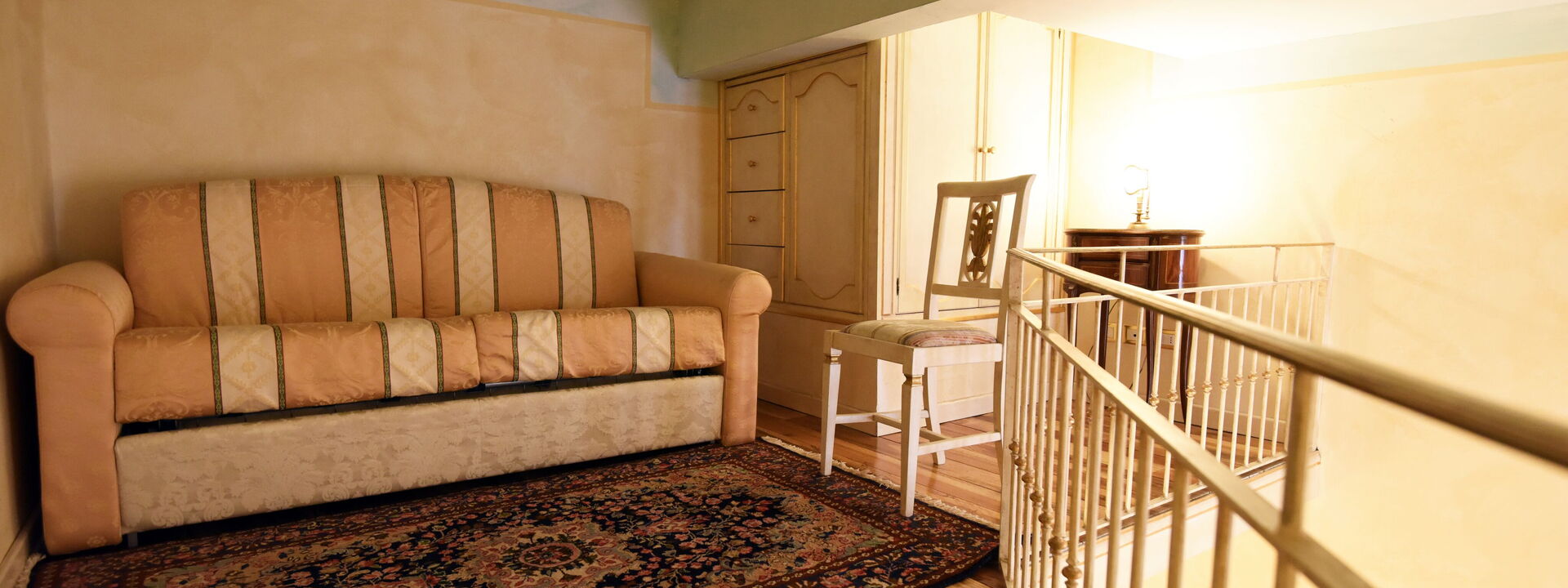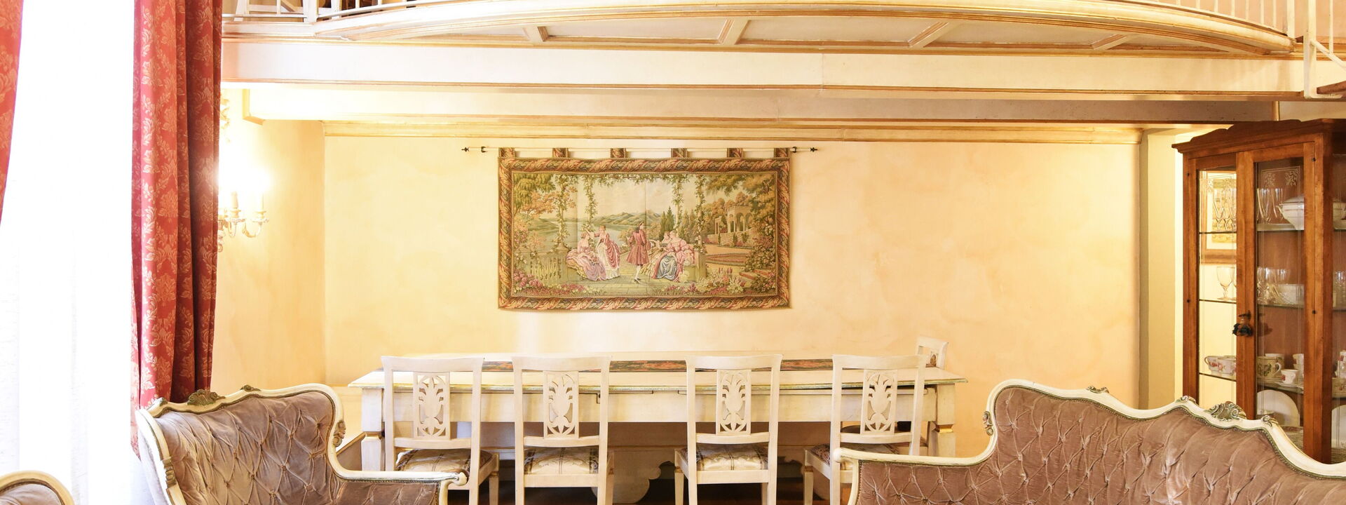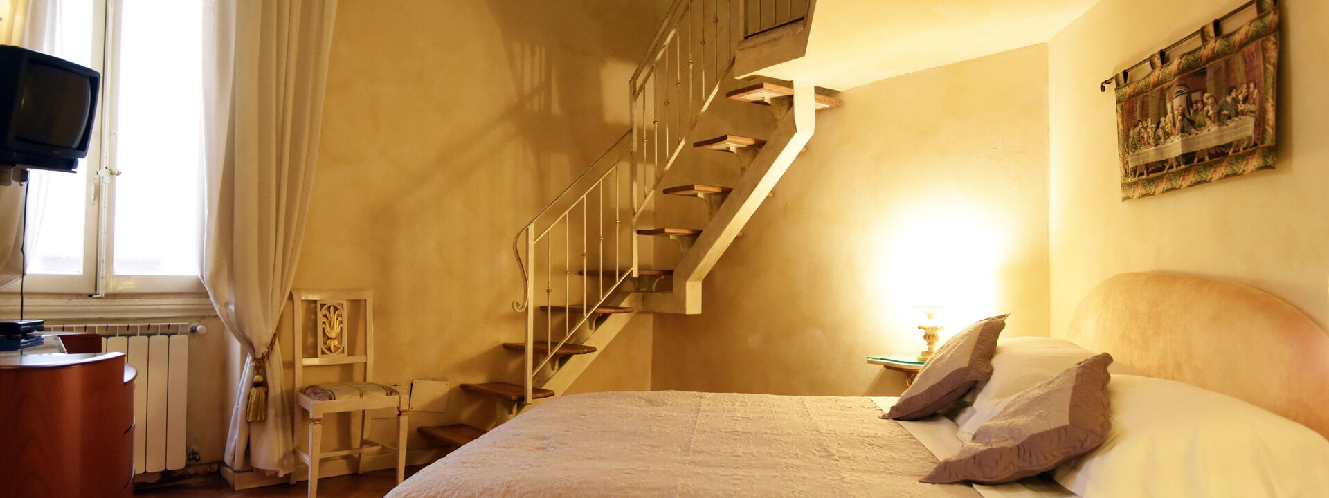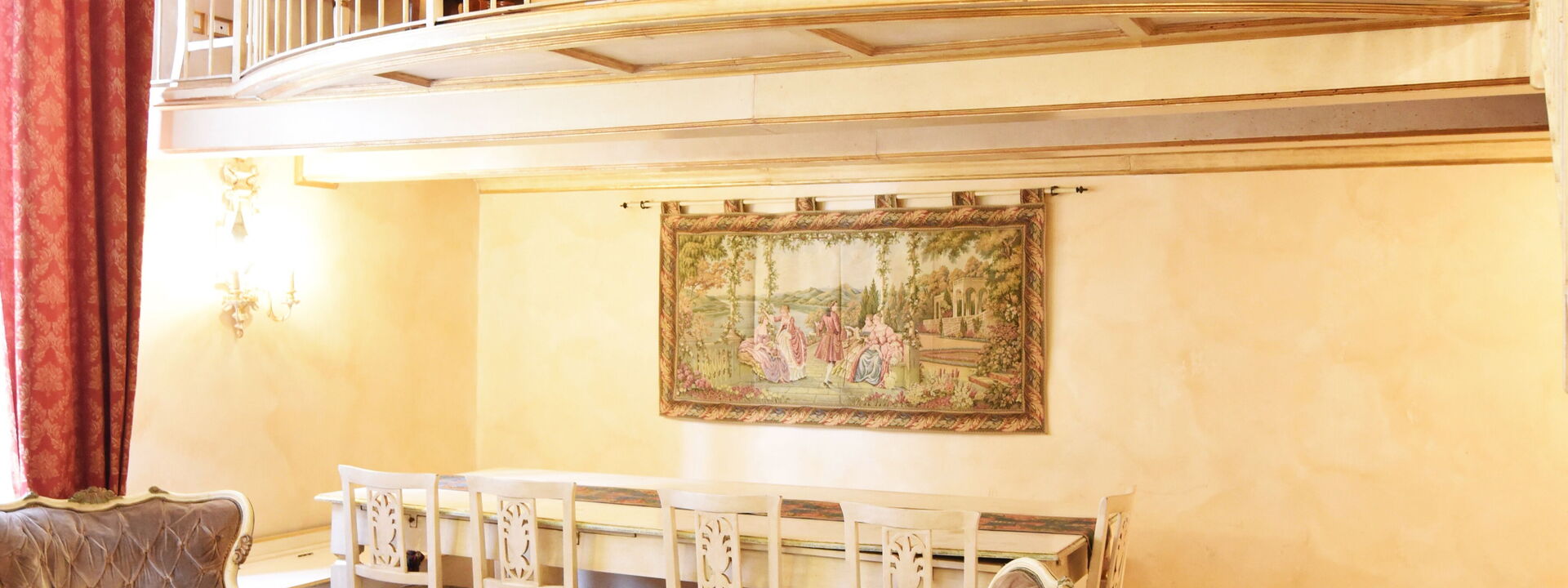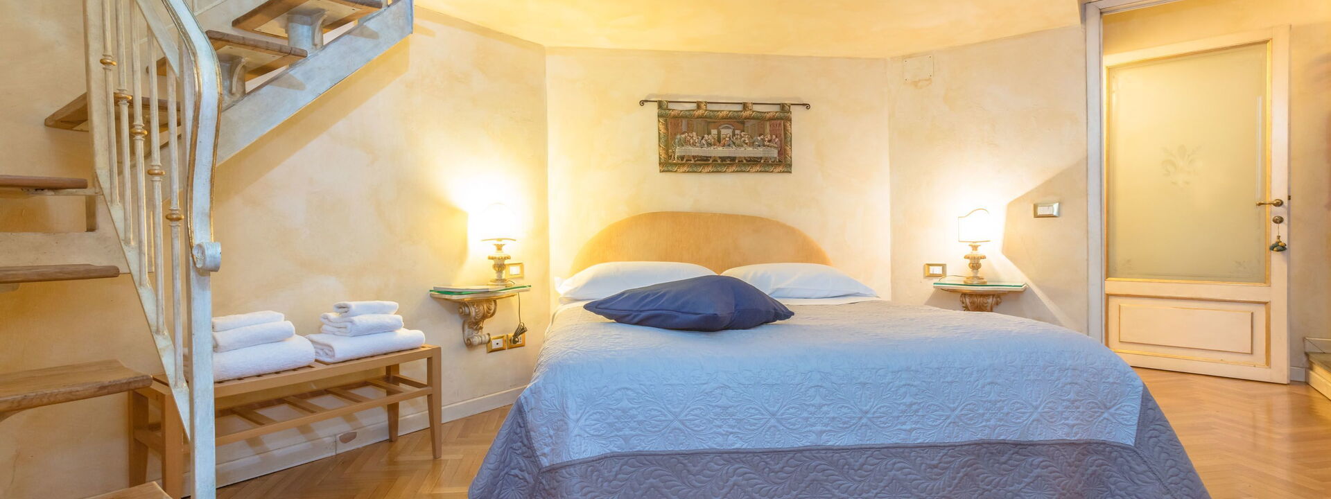 The living area consists of a large living room with a dining table to enjoy some intimate and private dinner, a comfortable three-seater sofa and two Florentine-style armchairs in the center, satellite TV, DVD player, and a large wooden dining table solid chest-decorated benches and chairs for 12 seats; a small staircase leads to a mezzanine decorated in wood with a sofa in Florentine embroidery which, if necessary, can become a sofa bed. In case you need to work during your stay here you will also find a comfortable study corner set up with a desk / desk, comfortable chair, table with printer, slippers for multi electrical outlets, cables and adapters, portable and folding laptop table that you can use for desk, bed, sofa or armchair, lamp with adjustable light and external monitor at your disposal. If you open the retractable glass door with typical Florentine decorations you will find the fully equipped kitchen fully equipped with a 4-burner hob, microwave oven, electric oven, fridge with freezer, dishwasher, American coffee machine and mocha coffee maker, griddle electric, dishes and utensils, electric kettle.