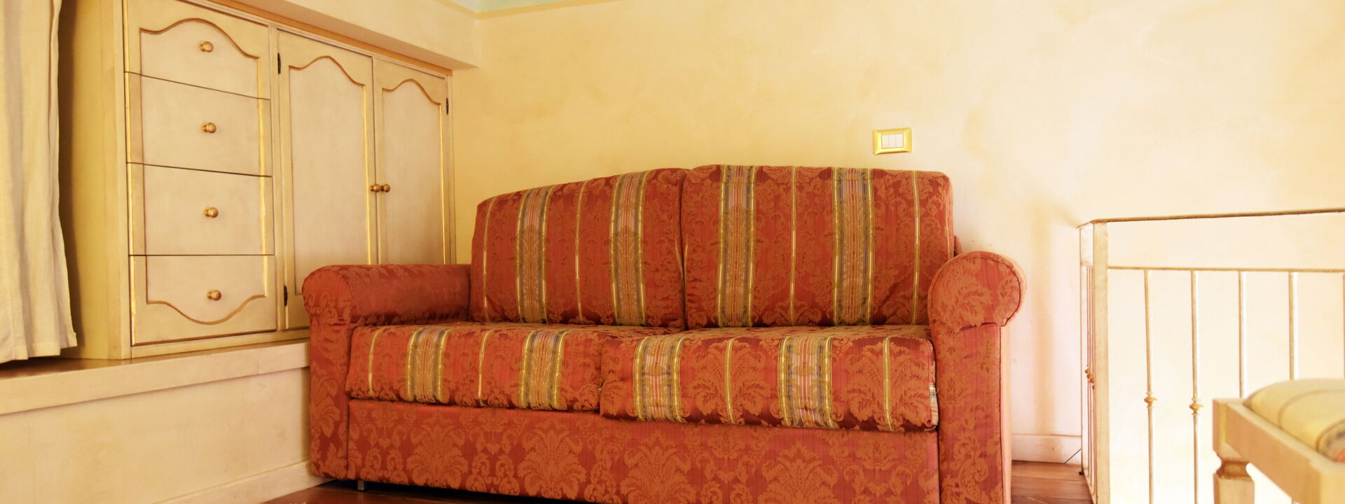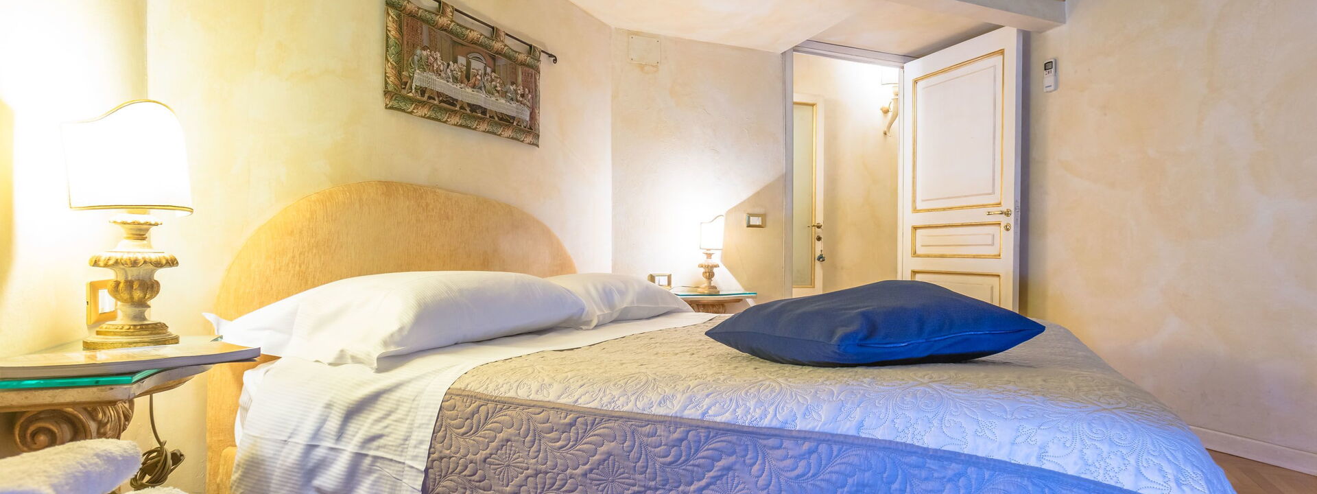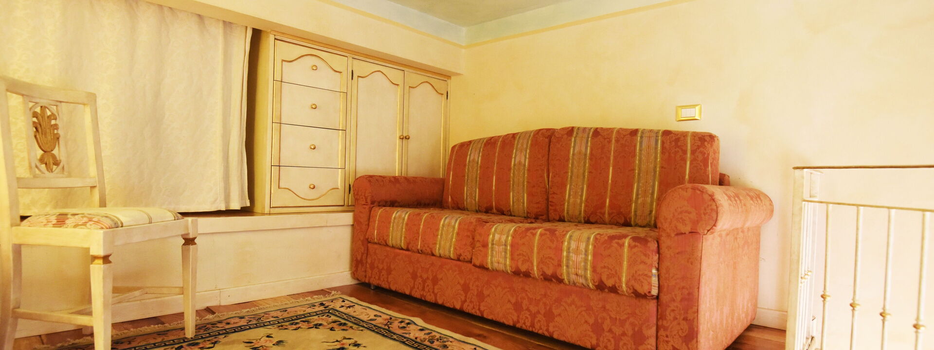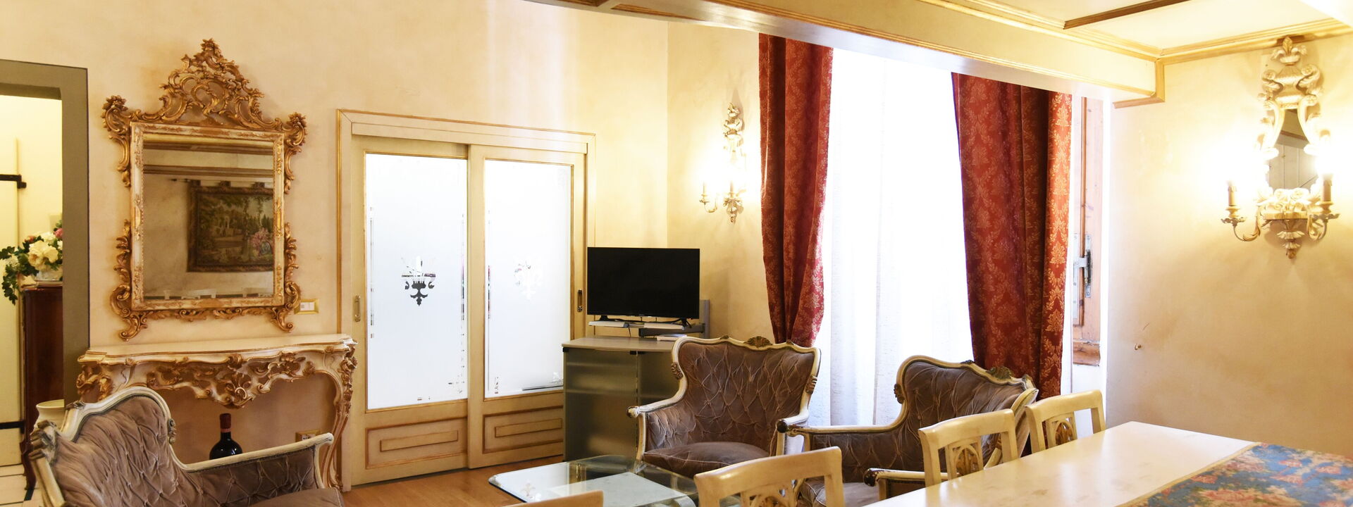 The living area consists of a large living room with a dining table to enjoy some intimate and private dinner, a comfortable three-seater sofa and two Florentine-style armchairs in the center, satellite TV, DVD player, and a large wooden dining table solid chest-decorated benches and chairs for 12 seats; a small staircase leads to a mezzanine decorated in wood with a sofa in Florentine embroidery which, if necessary, can become a sofa bed. In case you need to work during your stay here you will also find a comfortable study corner set up with a desk / desk, comfortable chair, table with printer, slippers for multi electrical outlets, cables and adapters, portable and folding laptop table that you can use for desk, bed, sofa or armchair, lamp with adjustable light and external monitor at your disposal. If you open the retractable glass door with typical Florentine decorations you will find the fully equipped kitchen fully equipped with a 4-burner hob, microwave oven, electric oven, fridge with freezer, dishwasher, American coffee machine and mocha coffee maker, griddle electric, dishes and utensils, electric kettle.